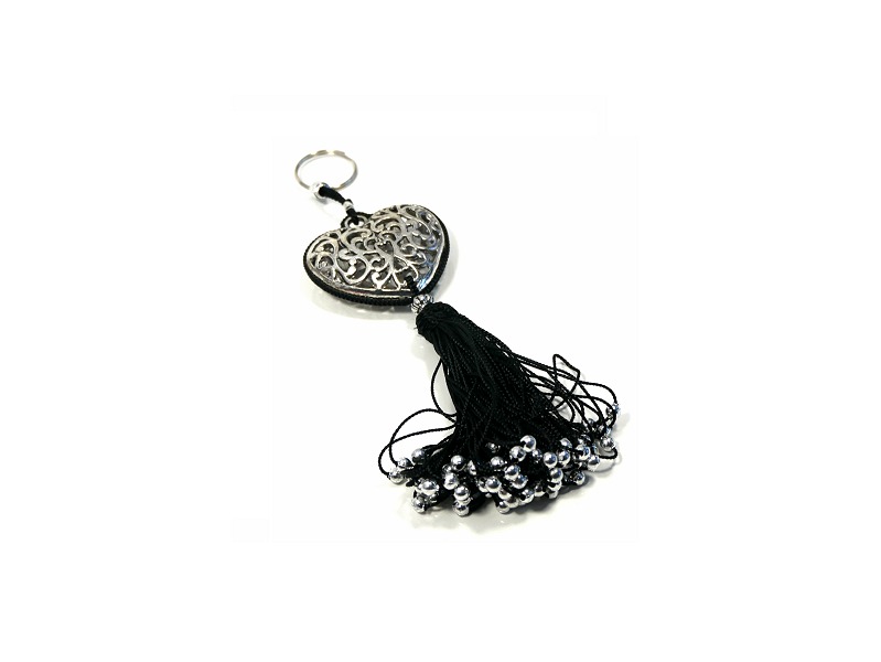 Porte-clés en métal argenté joliment ciselé, constitués de breloques, grand coeur, et de pompon en sabra, avec 8 coloris disponibles... De jolis agréments argentés font de ces porte-clés des pièces originales.