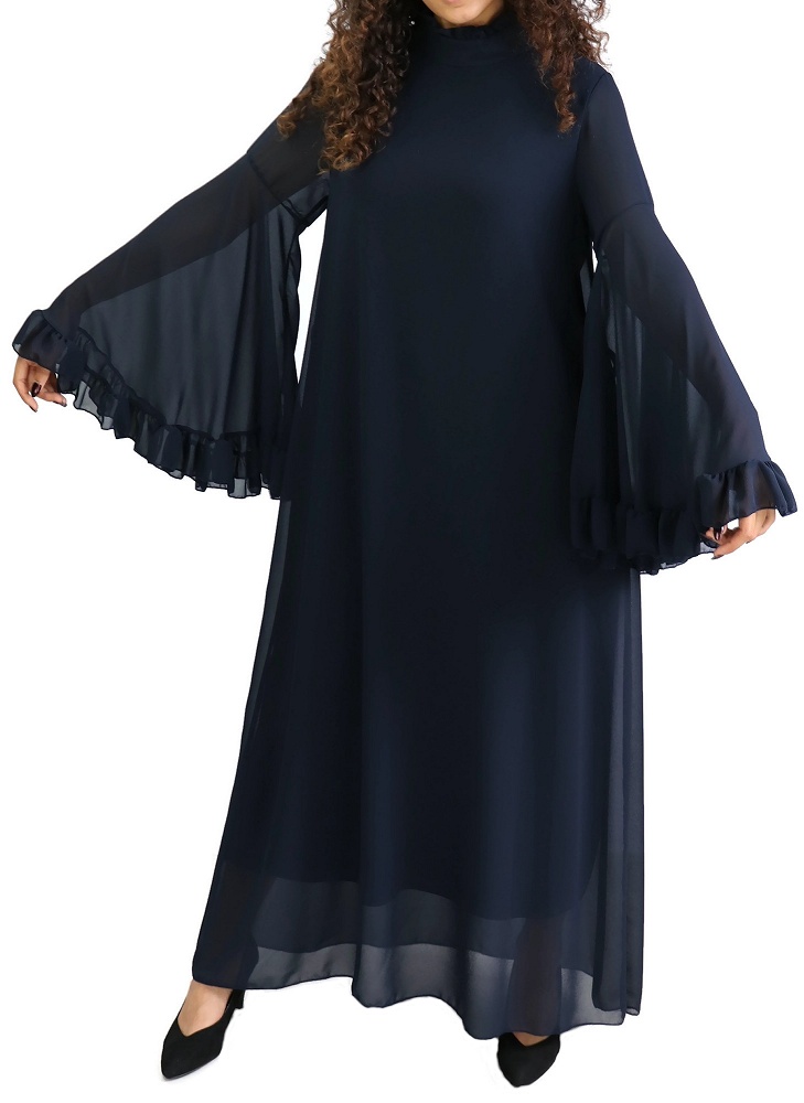 Optez pour cette robe style romantique, ultra féminine et pile dans la tendance. Col officier manches évasées avec une ceinture assortie. Tissu de type mousseline. Entièrement doublée (sauf les manches).