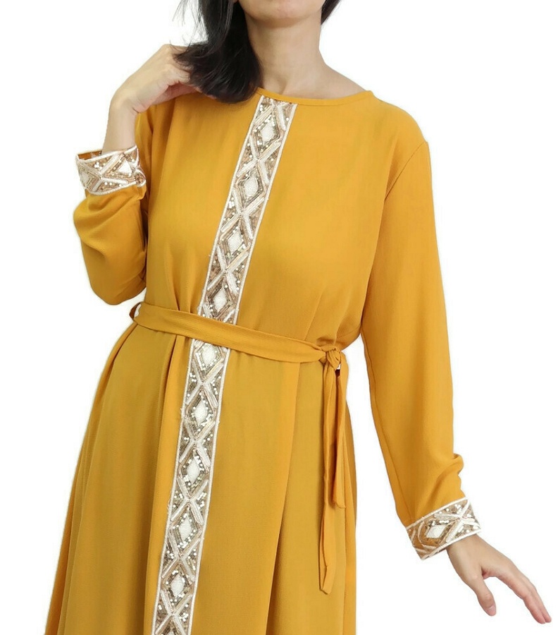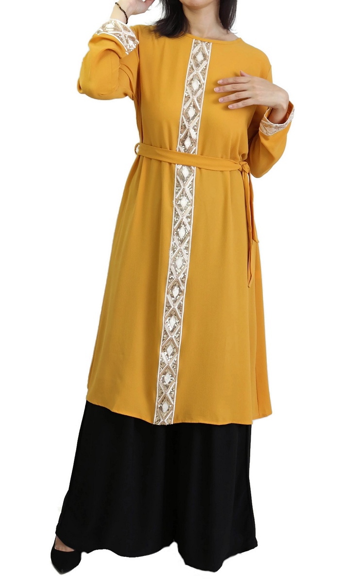 Cette tunique en crêpe, légère et agréable, est ornée d'une bande brodée à strass dorés. Elle peut se porter décontractée ou un peu plus habillée avec sa ceinture assortie.