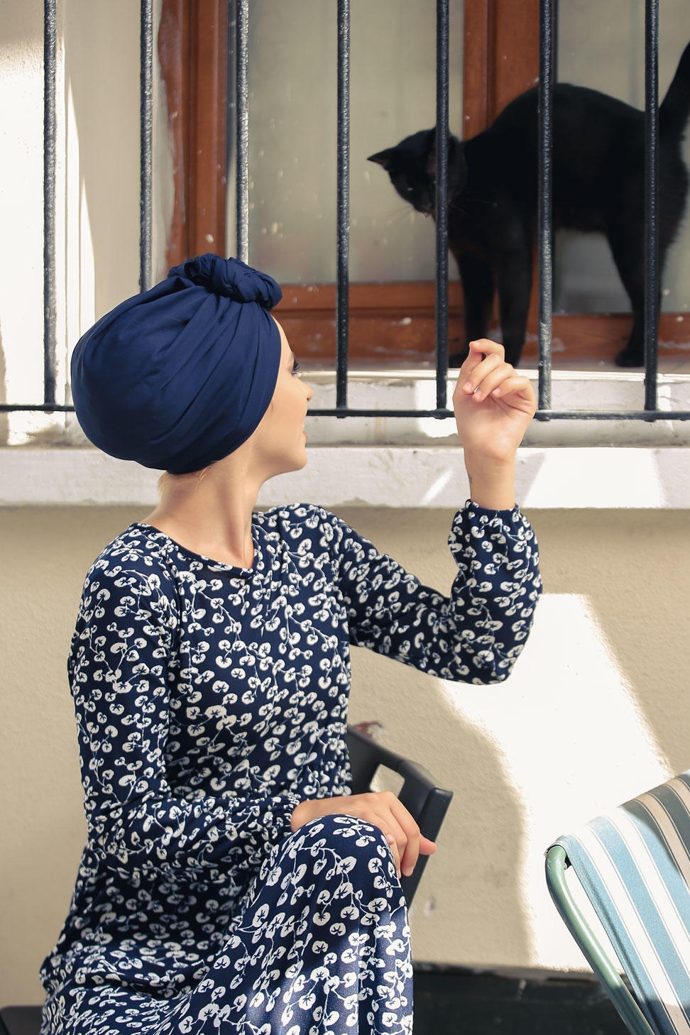 Robe à motifs feuille nénuphar. Coupe légèrement évasée, col rond, manches longues, élastiques aux poignets, froncé au niveau de la taille. Tissu léger et fluide.