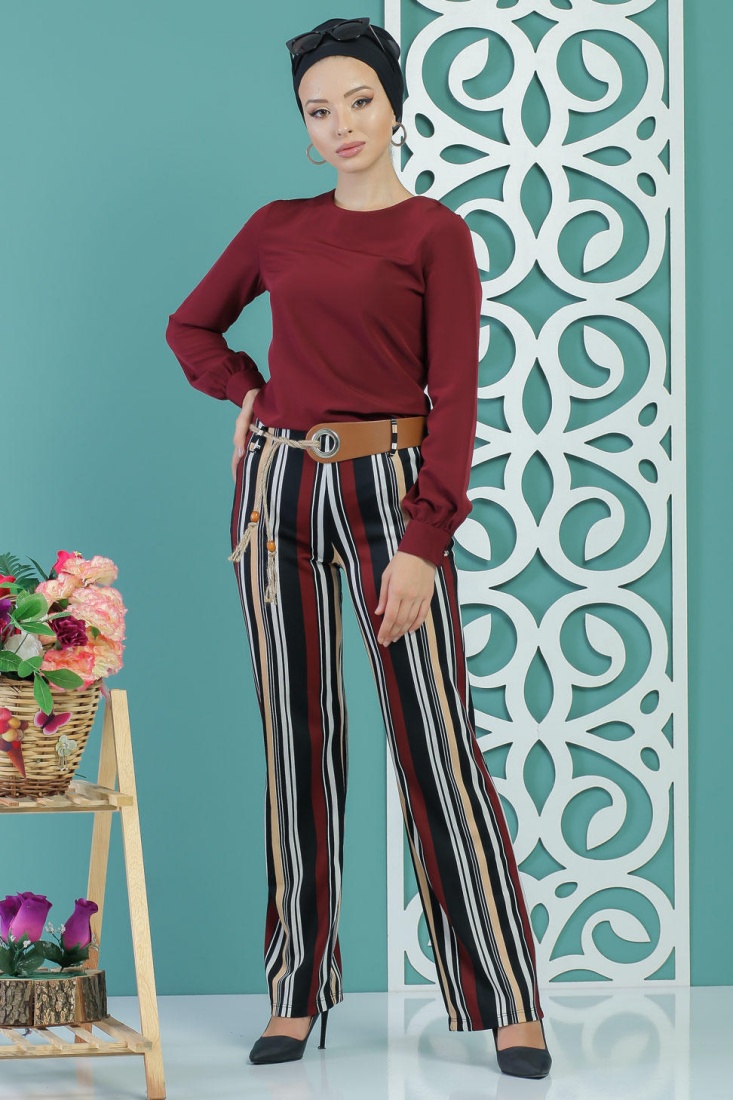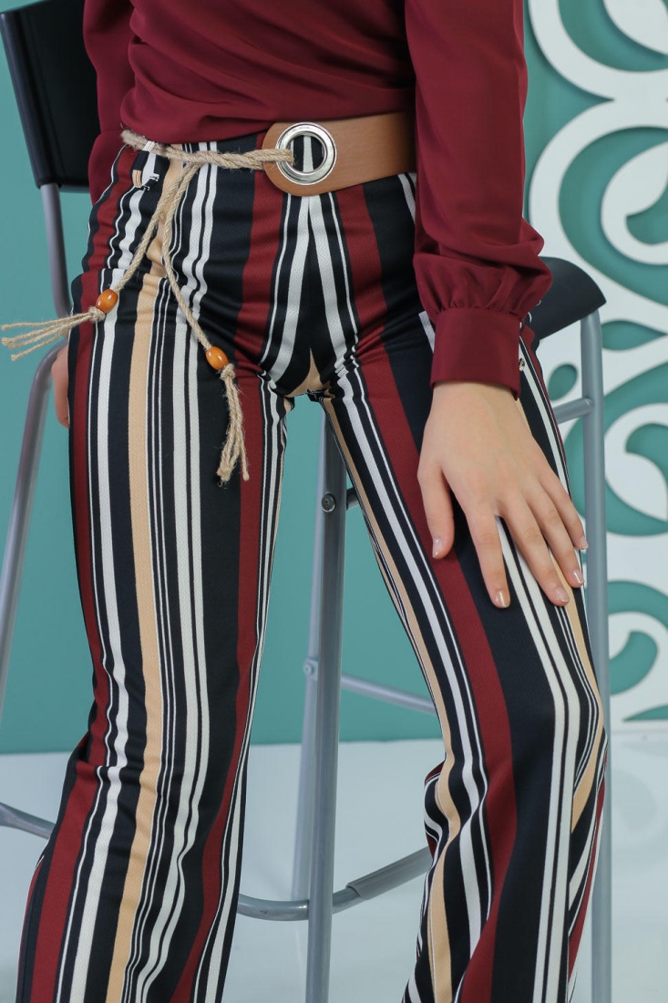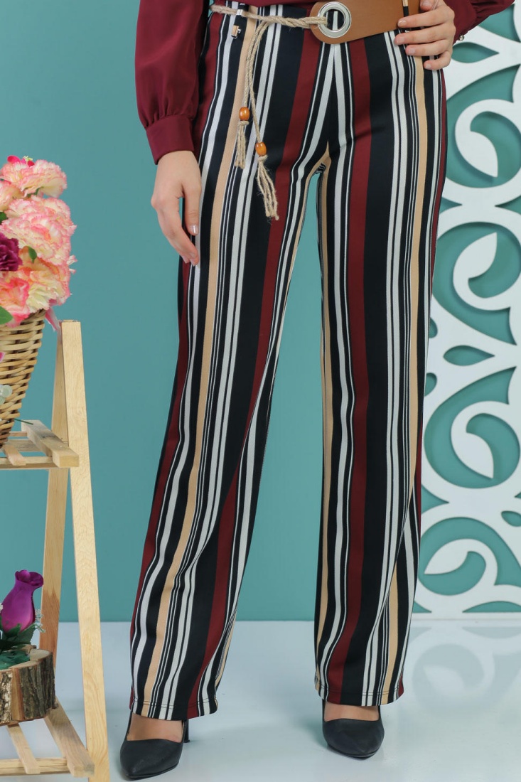 Pantalon à rayures, coupe droite, fermeture zippée sur le coté, accompagné d'une ceinture à passants, tissu peigné.