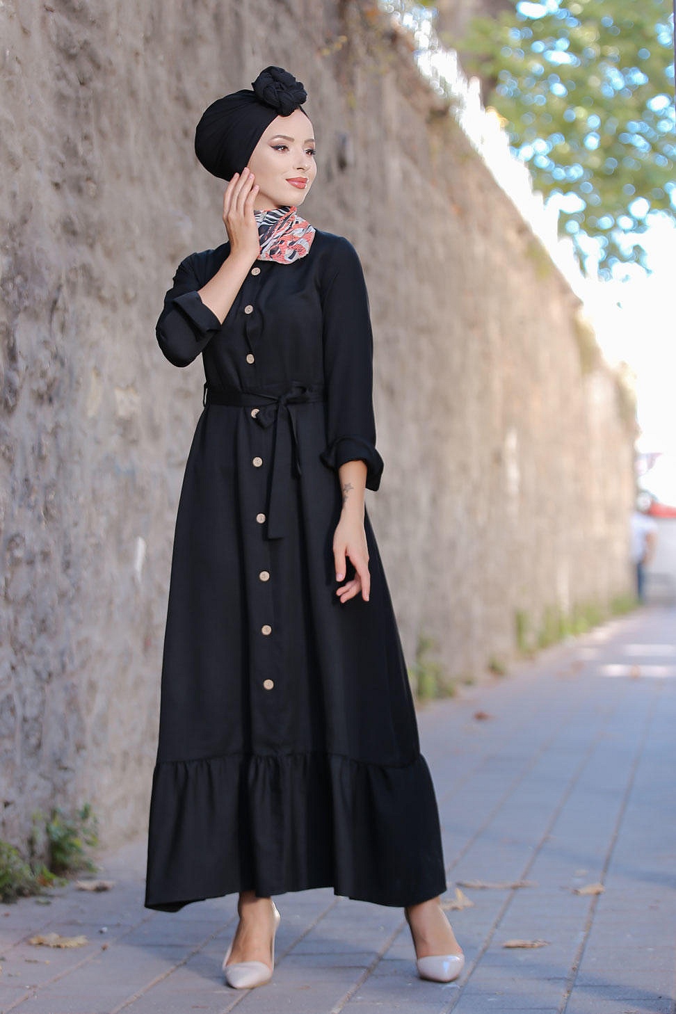 Robe longue, col chemise, manches finition boutons aux poignets, taille cintrée, ceinture à passants, fermeture boutons sur toute la longueur. Sobre et élégant, ce modèle est adapté pour être porté quotidiennement, il sera encore plus mis en valeur avec quelques accessoires.