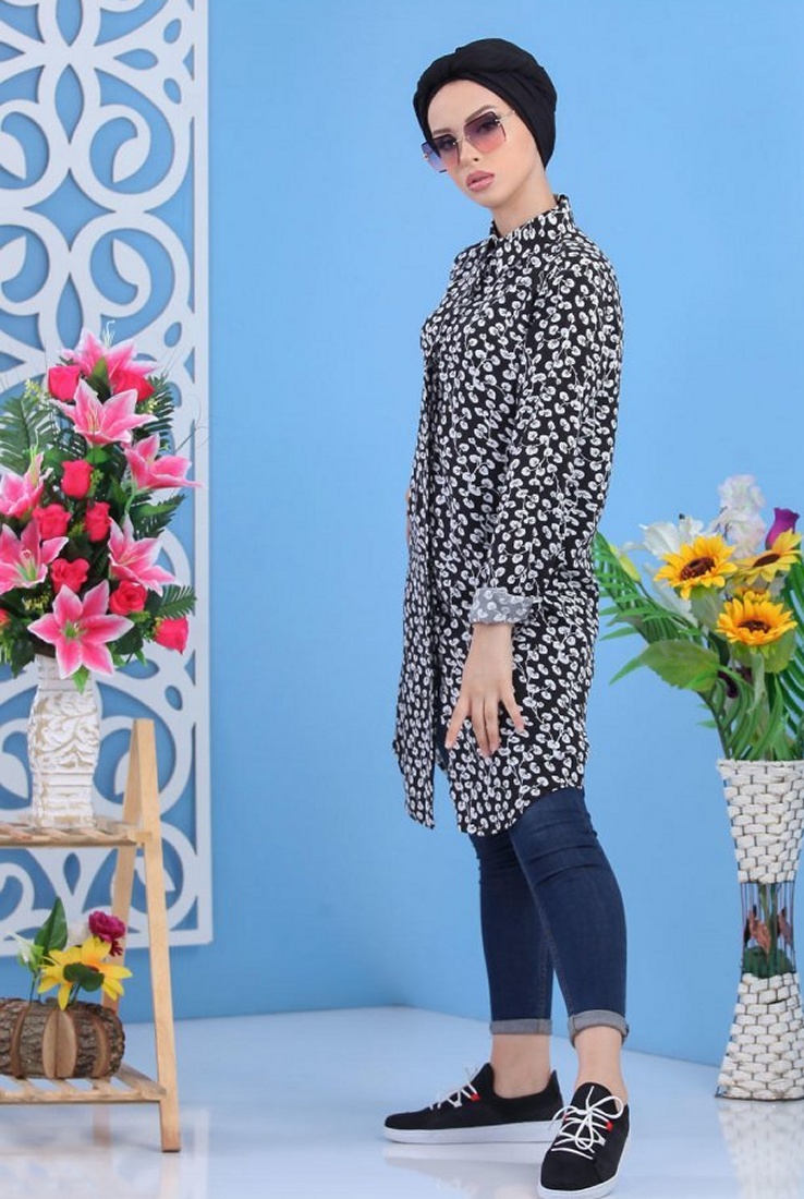 Chemise longue à motifs, col chemise, manches finition boutons aux poignets, coupe légèrement évasée, extrémités arrondies. Ce modèle à imprimés "feuille nénuphar", très tendance, vous permettra de sortir du commun. Vous pourrez le porter aussi bien en journée qu'en soirée.