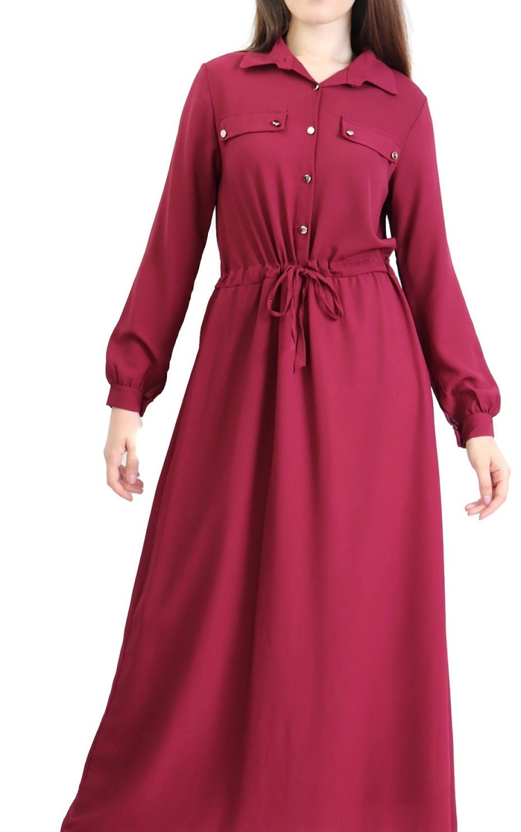 Robe longue avec col chemise, doublée en bas, fermeture boutons devant et aux poignets, poches plaquées, cordon de serrage à la taille.