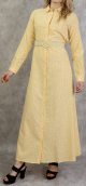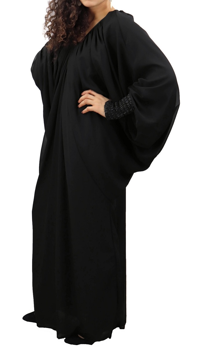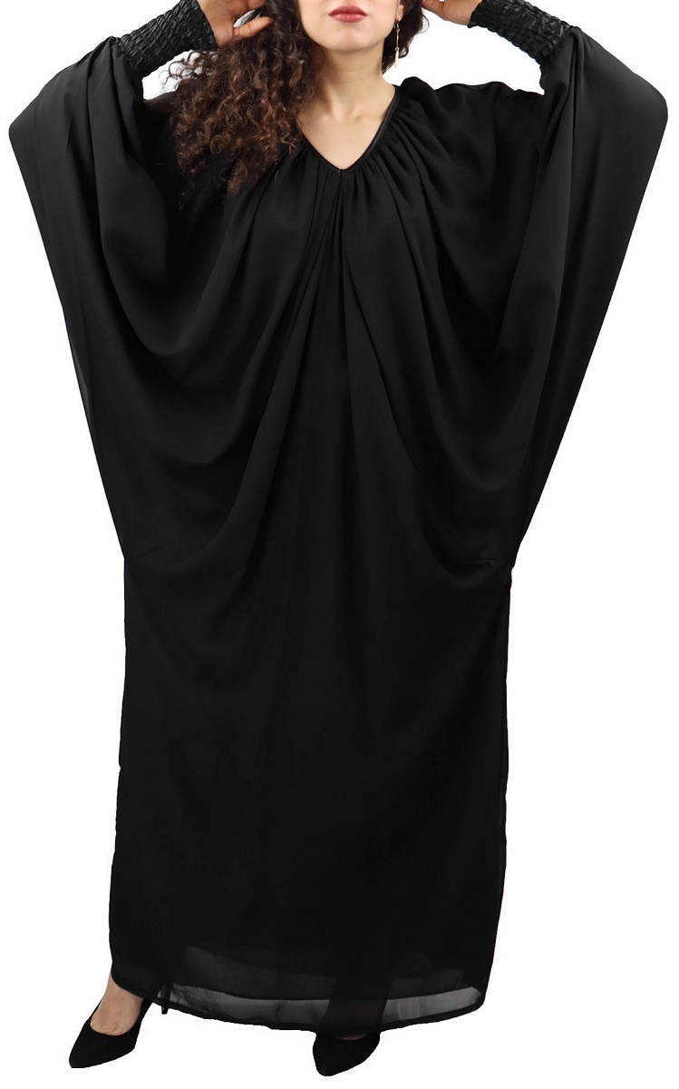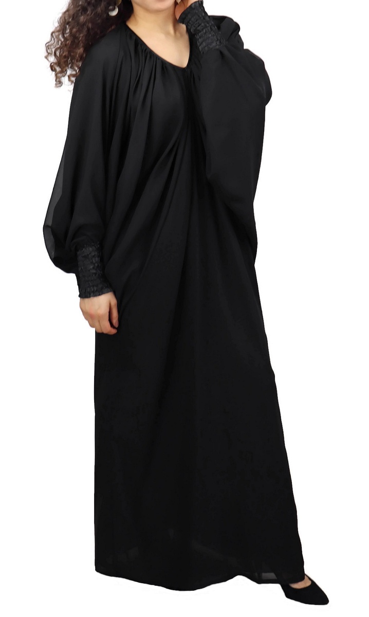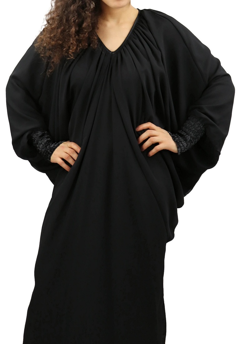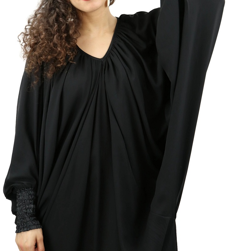 Robe confortable et habillée . Col en V satiné, manches amples resserrées aux poignets par une bande élastique froncée et satinée. Tissu léger style "organza" accompagné d'une doublure. Coupe papillon en haut et droite au niveau des hanches.