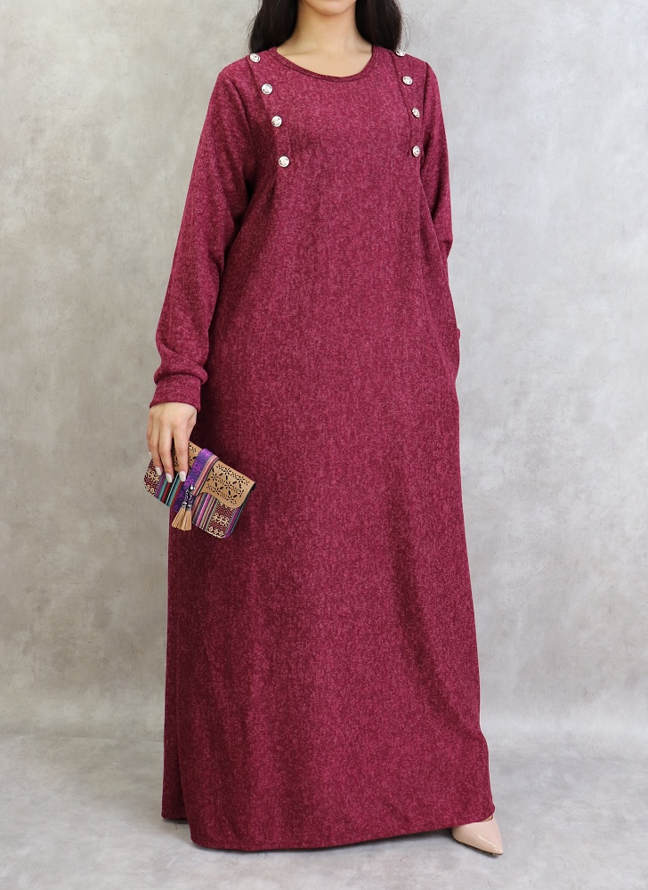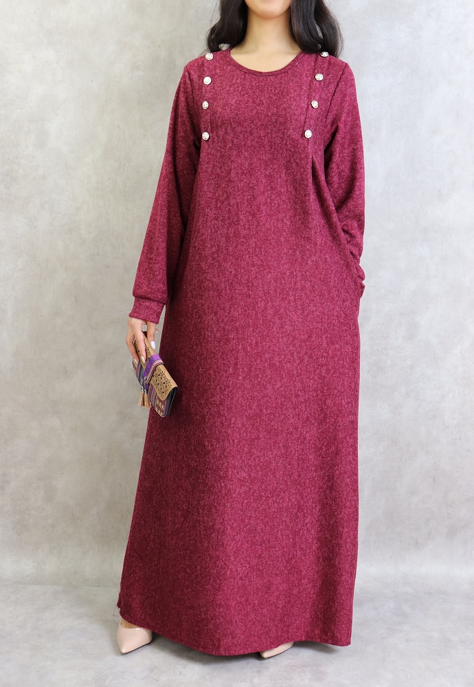 Robe longue, col rond, coupe droite, décoration boutons argentés, poches latérales, tissu chiné.