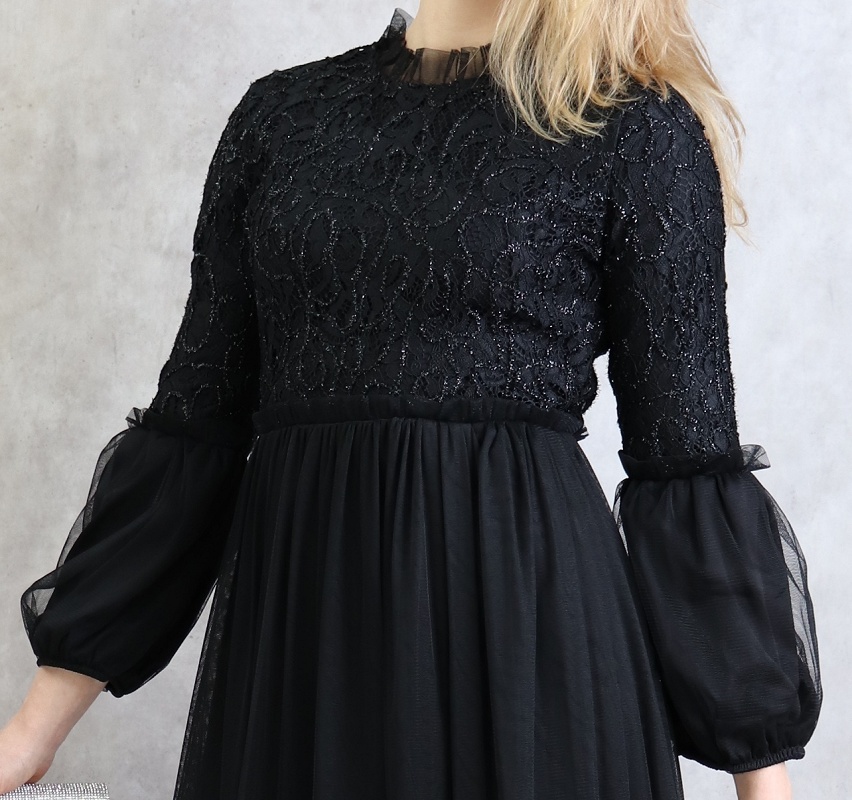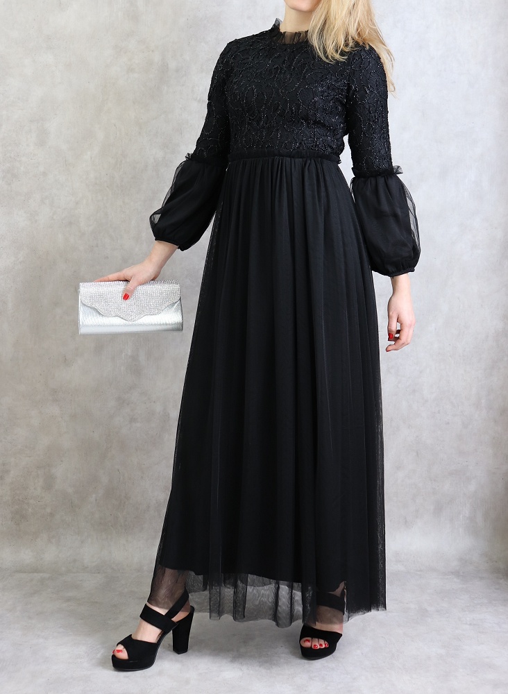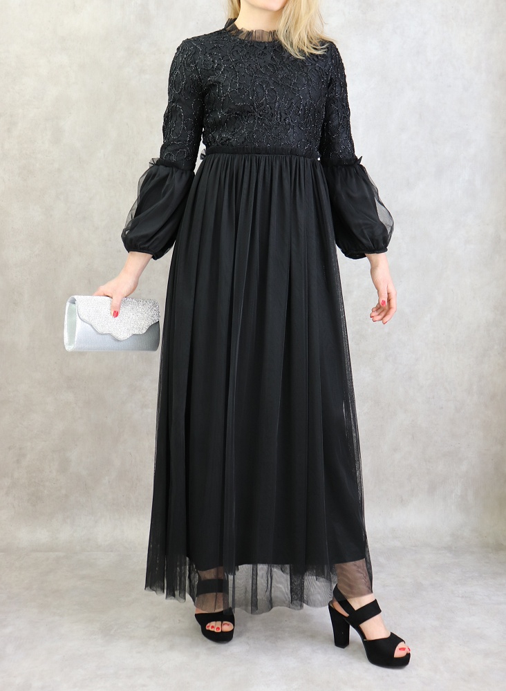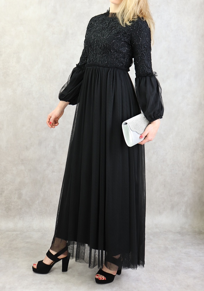 Robe longue, col rond orné d'une collerette, manches finition élastique aux poignets, fermeture à glissière dans le dos, entièrement doublée, broderies sur le buste et une partie des manches, tulle sur tout le reste de la robe.