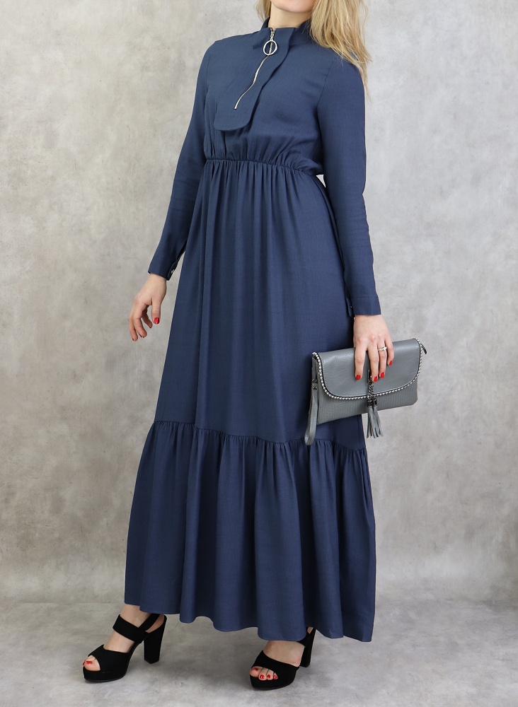 Robe longue, col Mao, fermeture éclair sur le buste, manches finition bouton, taille cintrée élastique, large ceinture assortie, tissu effet lin tissé.