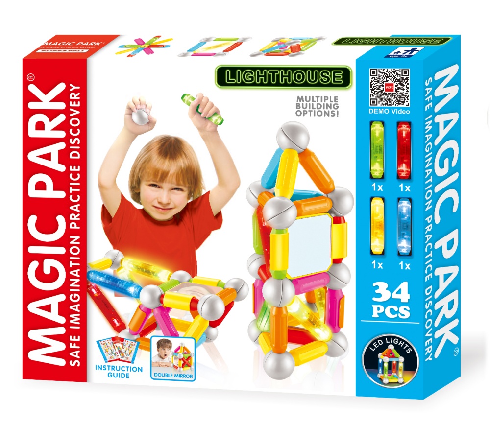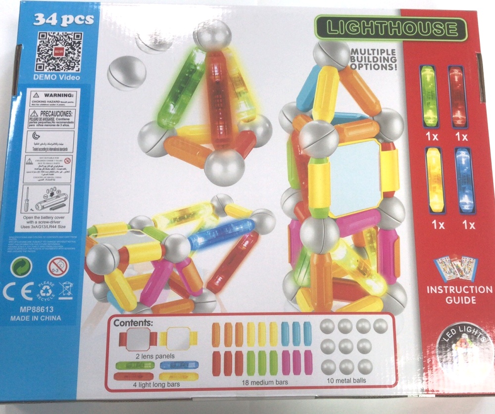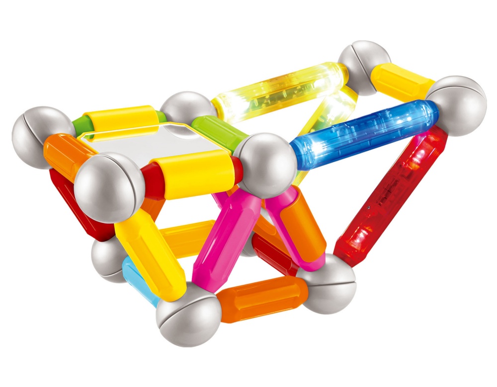 Dans ce coffret, en plus des boules et barres magnétiques, l'enfant dispose de barres lumineuses pour intégrer des effets de lumières à ses créations...