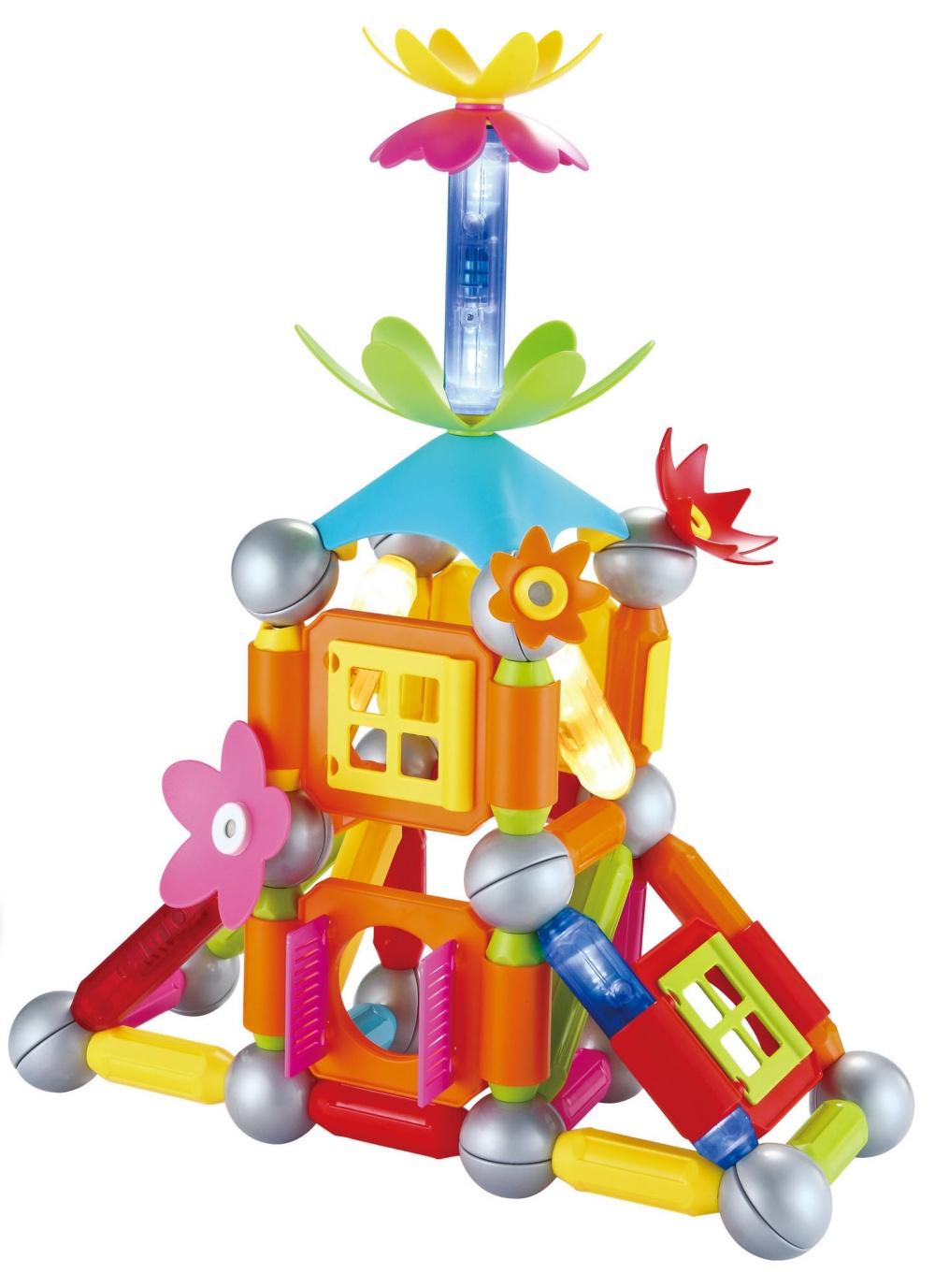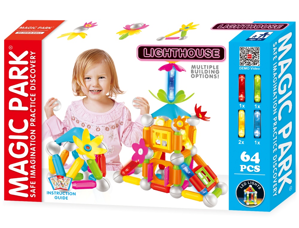 Dans ce coffret, en plus des boules et barres magnétiques, l'enfant dispose de barres lumineuses pour intégrer des effets de lumières à ses créations...