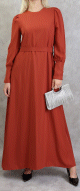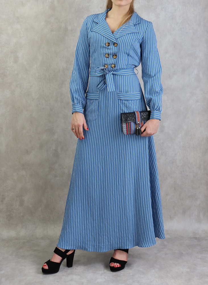 Robe longue, col tailleur, manches finition bouton aux poignets, taille cintrée, ceinture assortie à passants, fermeture boutons sur le buste, 2 grandes poches, tissu non transparent, bonne tenue.