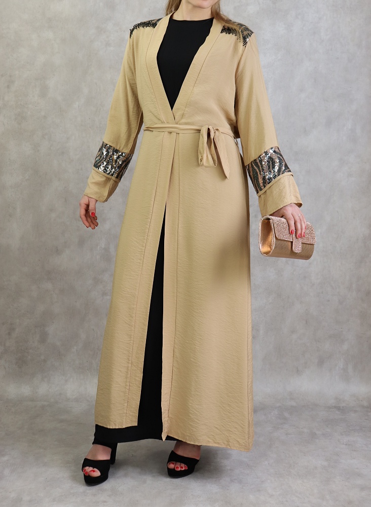 Kimono long, manches larges, ceinture assortie à passant, décorations strass sur les épaules et les poignets, tissu fluide et non transparent.