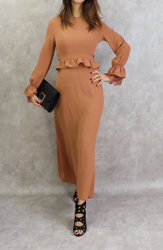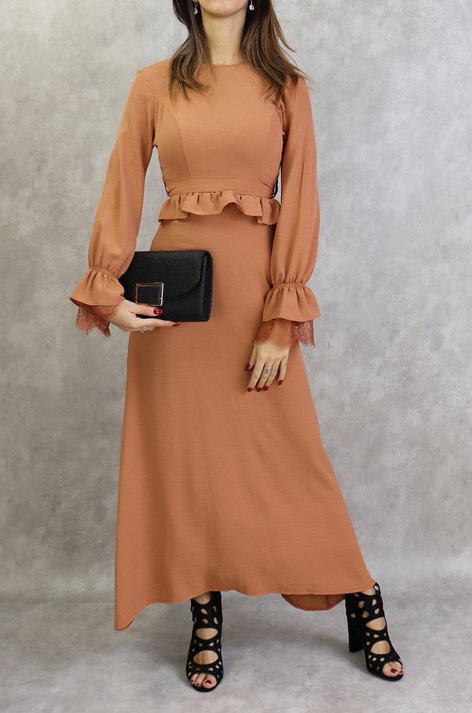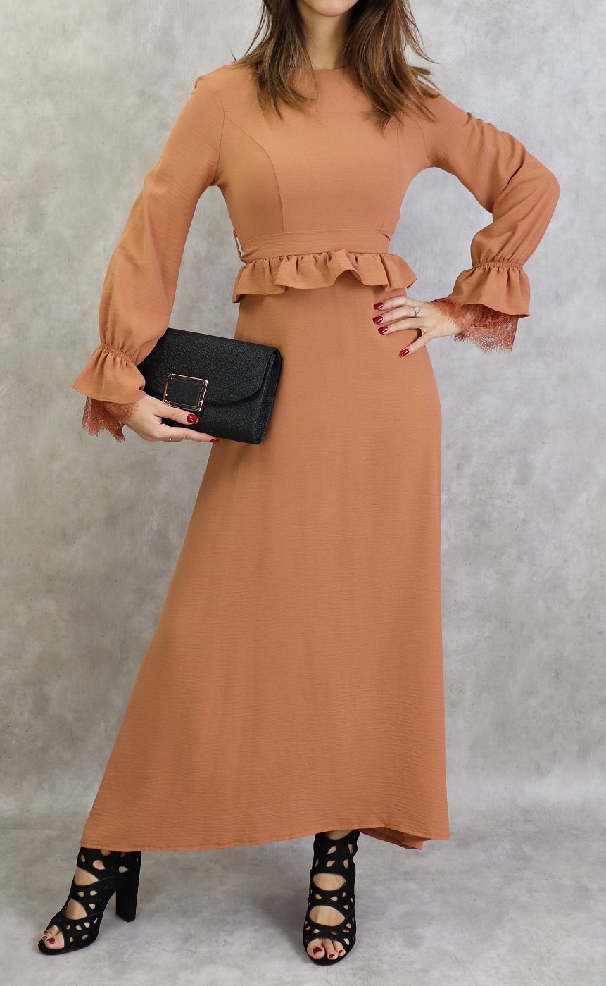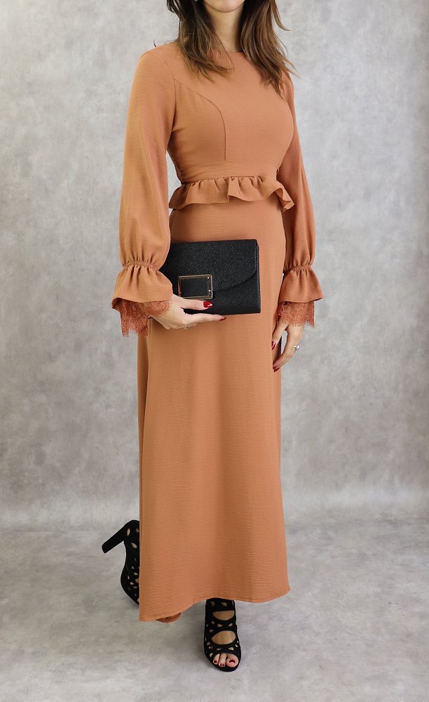 Robe longue évasée, col rond, fermeture glissière au dos, manches finition élastique froufrous et dentelles aux poignets, taille cintrée ornée d'un volant, ceinture assortie à passants, tissu doux, fluide et opaque.