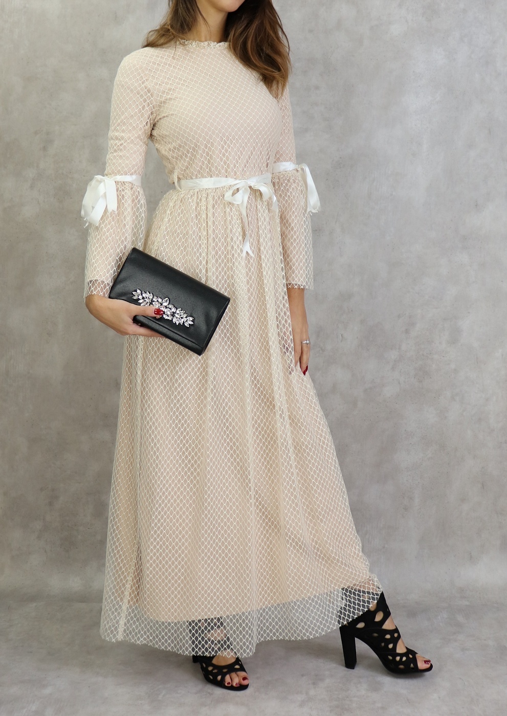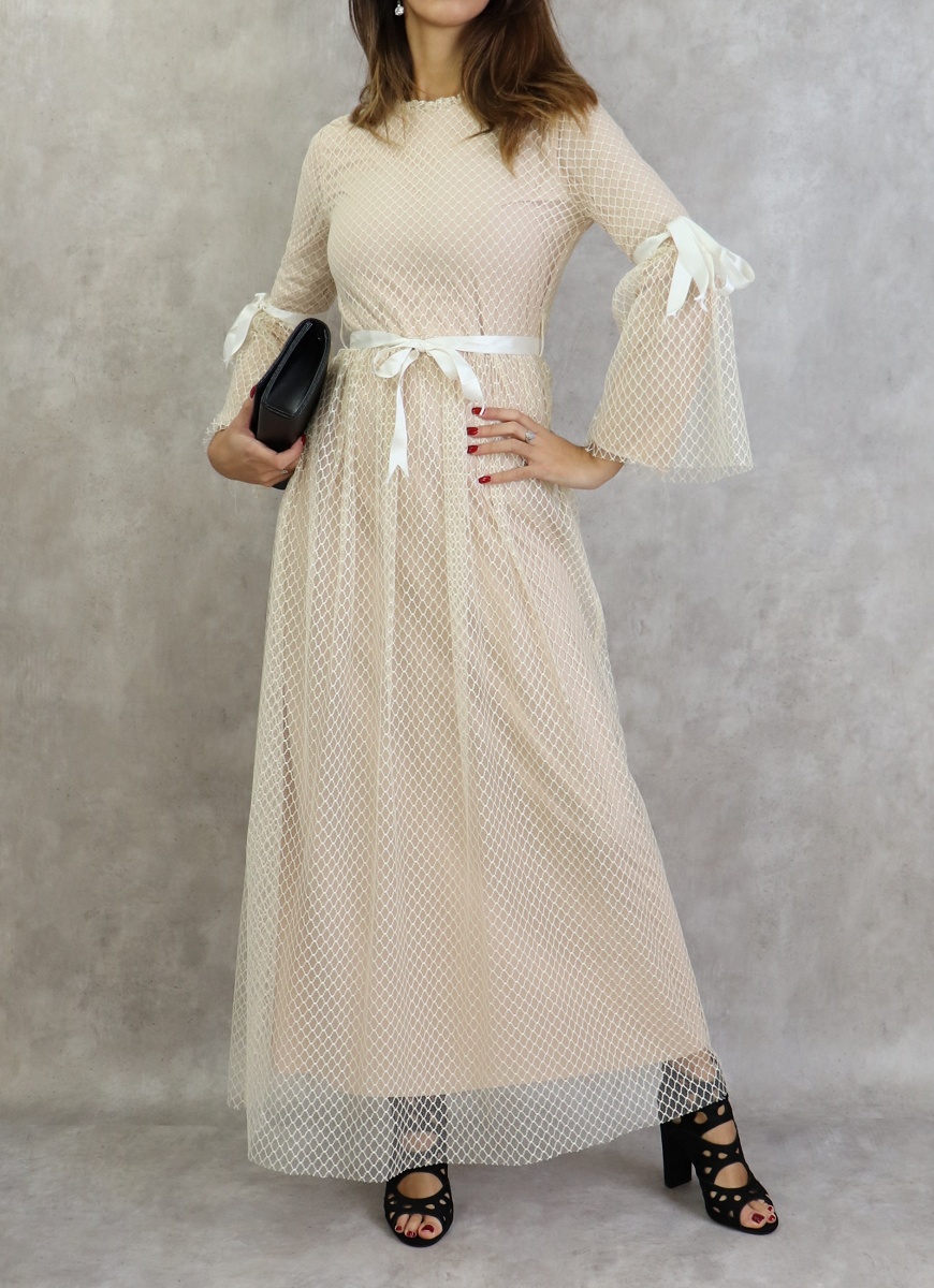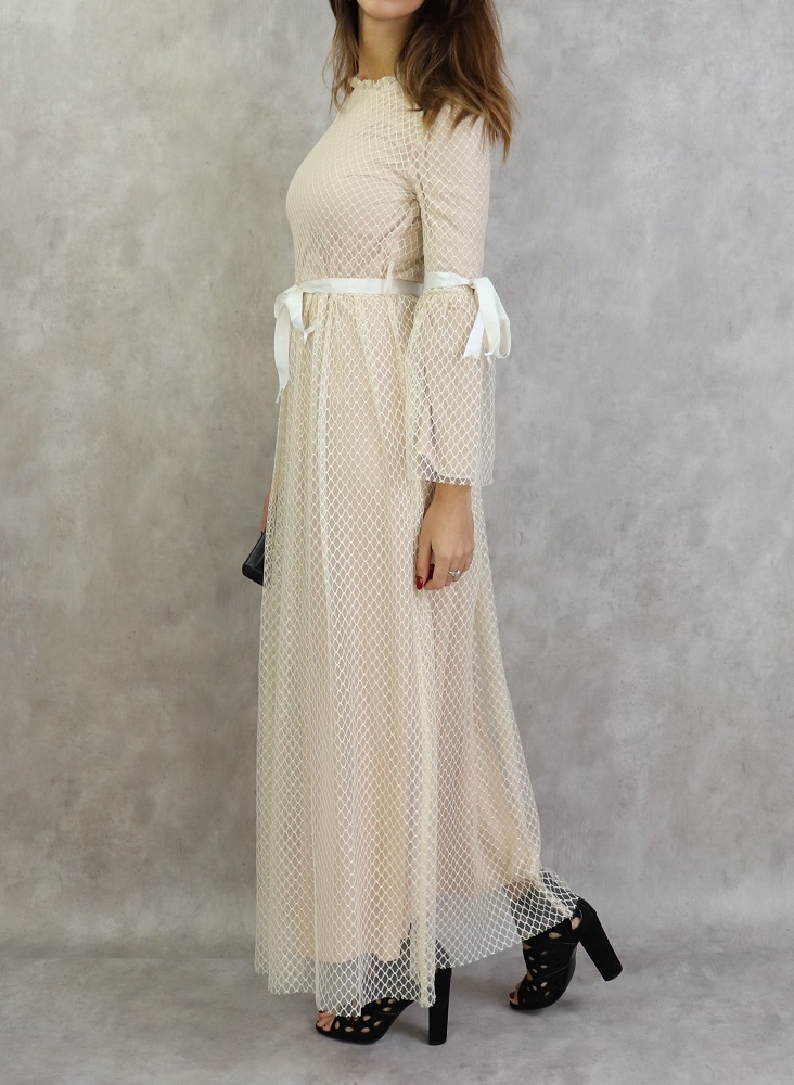 Rien de tel que ce modèle pour faire une apparition remarquée, notez les petits détails tels les rubans de satin sur les manches et la taille.