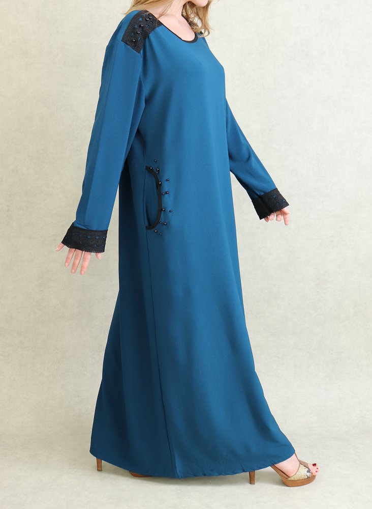 On est fan de cette robe, avec broderies et perles noires sur les épaules et aux poignets. Manches longues. Ses deux poches disposées sur les côtés vous seront d'une grande utilité.