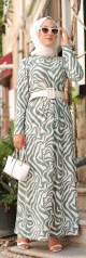 Très belle robe longue, entièrement doublée, col en V, ornée avec pompons et strass, taille élastiquée, manches longues poignets élastiques. Tissu de type mousseline.