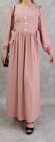 Robe tendance à motifs plume, manches longues, col Mao entre ouvert finition boutons. Coupe évasée légèrement cintrée à la taille et un effet volant à mi longueur.