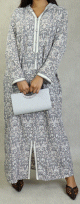 Robe longue entièrement doublée, coup droite, belles décorations sur le col V, ceinture assortie à passant pouvant s'attacher devant comme derrière, tissu fluide est très léger.