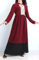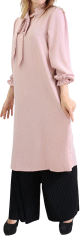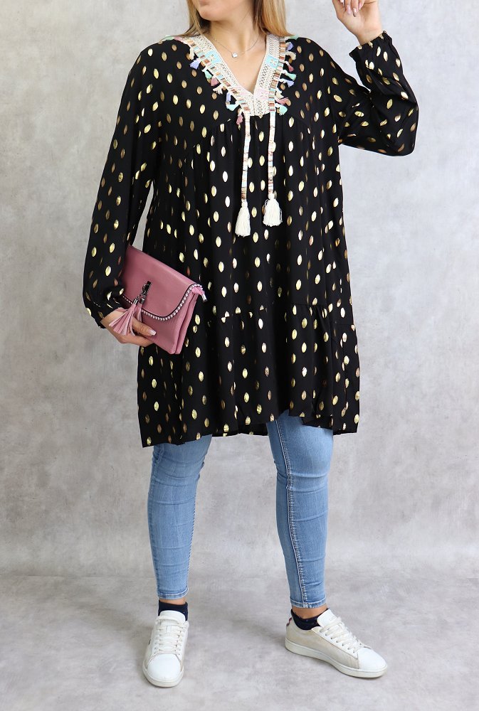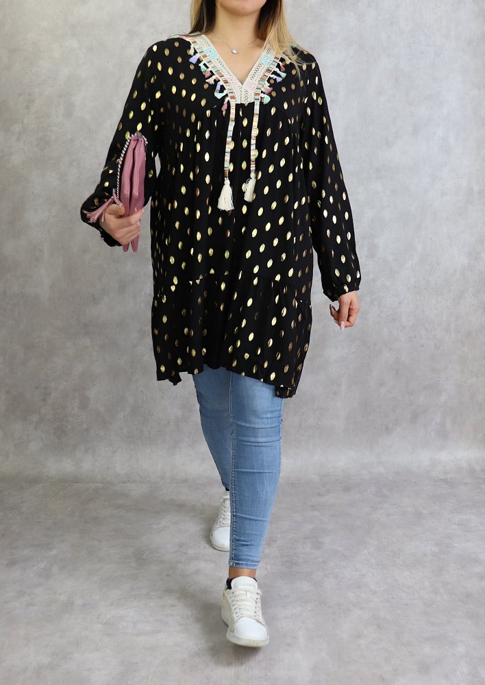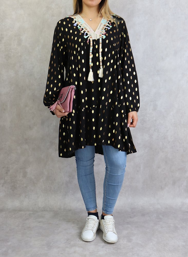 Tunique longue, col en V avec broderies, manches longues, poignets élastiques. Motifs dorés. Coupe évasée, matière légère et fluide.