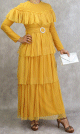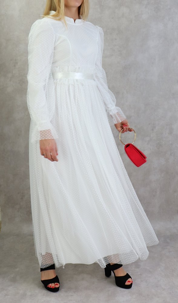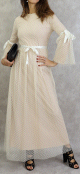 Robe longue, col rond, fermeture glissière au dos, manches longues finition élastique et froufrous aux poignets, taille cintrée ornée d'un ruban satiné. Coupe évasée vers la bas, entièrement doublée.