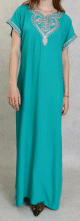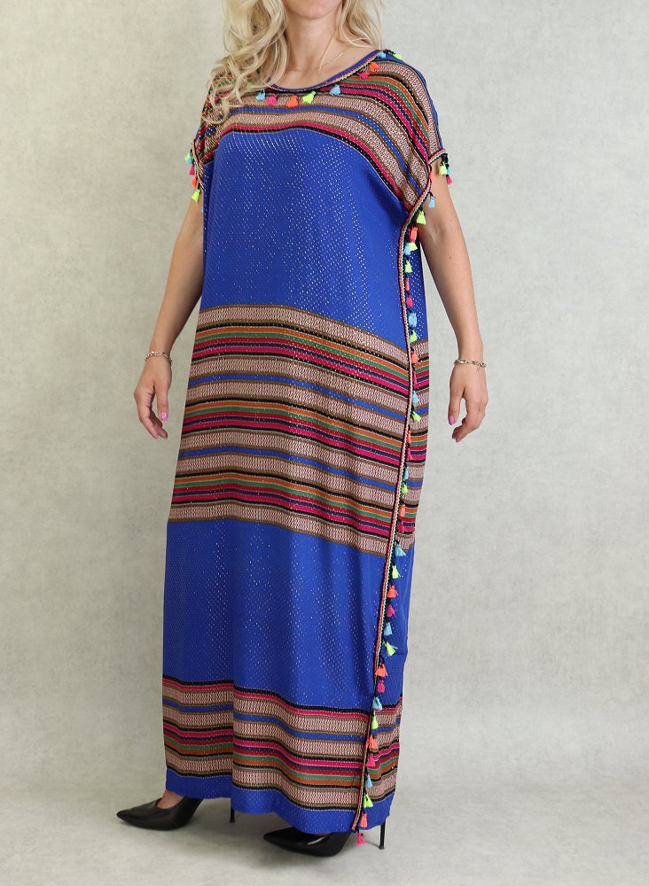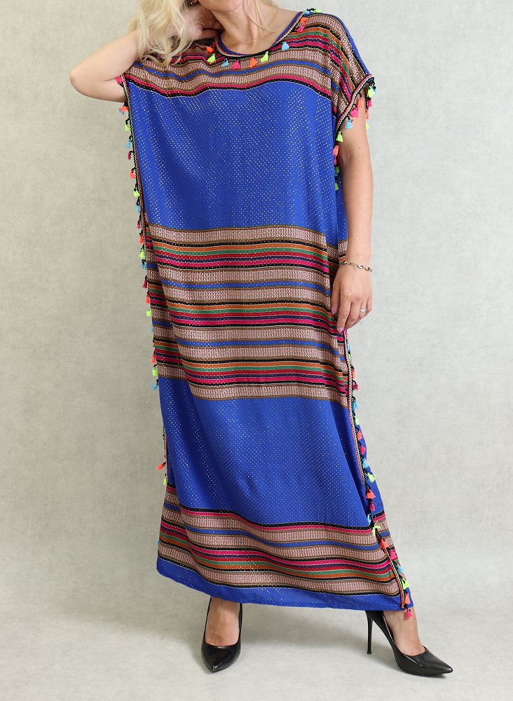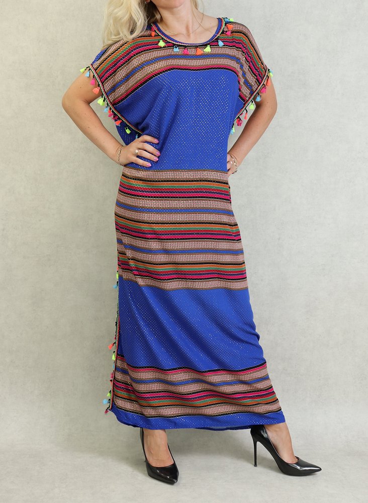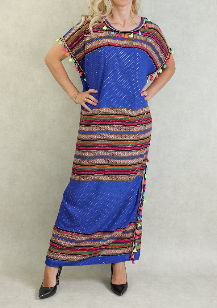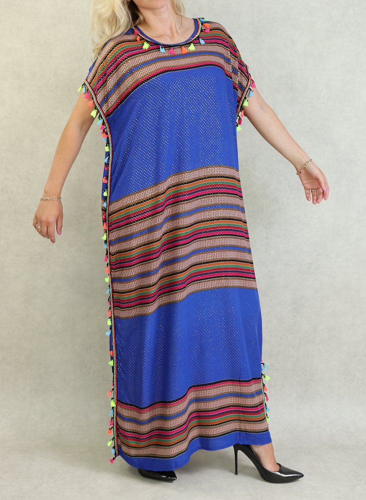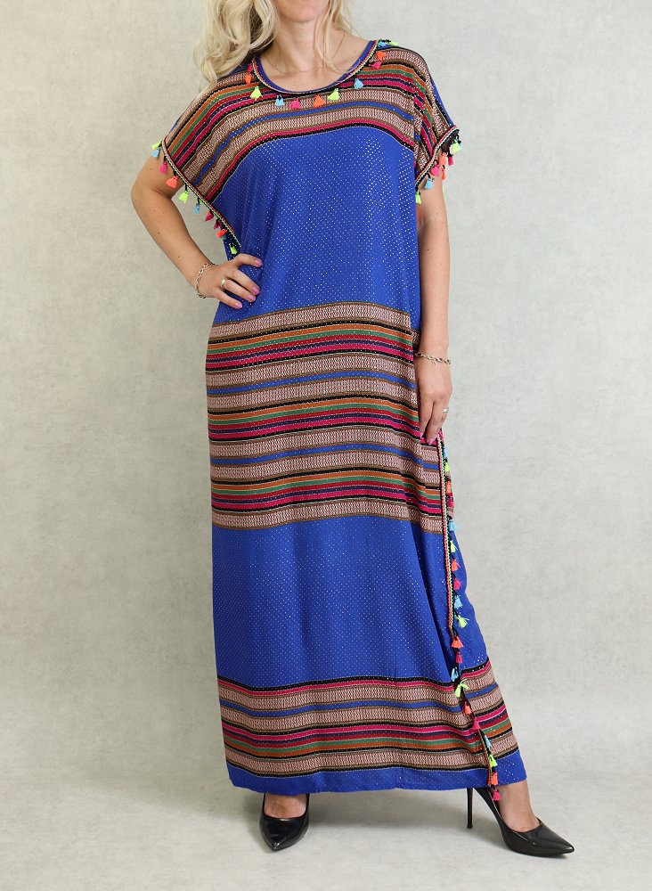 Robe orientale longue riche en couleurs, avec rayures horizontales multicolores sous forme d'arc-en-ciel, des petits pompons multi-couleurs sur toute la longueur des deux côtés et au niveau du col. Tissu pailleté offrant un effet d'étoiles dans le ciel de la nuit pour toute la robe ! Coupe droite, col rond. On aime son tissu de qualité au tombé fluide et confortable. Agréable robe d'été recommandée.