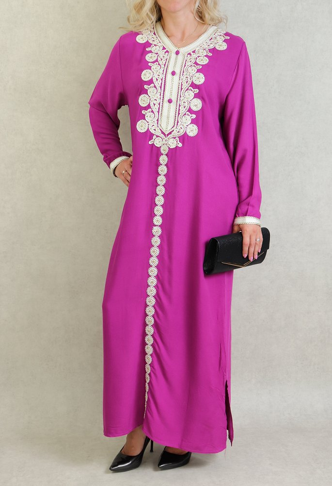 Robe Algérienne longue avec broderie et strass sur toute la longueur ; style caftan. Le double avantage de ce modèle est d'être confortable et élégant à la fois.