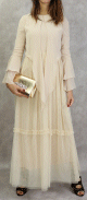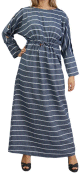 Robe longue, col semi ouvert, fermeture cordons avec pompons, manches finition élastiques, fermeture à glissière sur le coté, taille cintrée et élastique tissu fluide, léger et opaque.