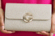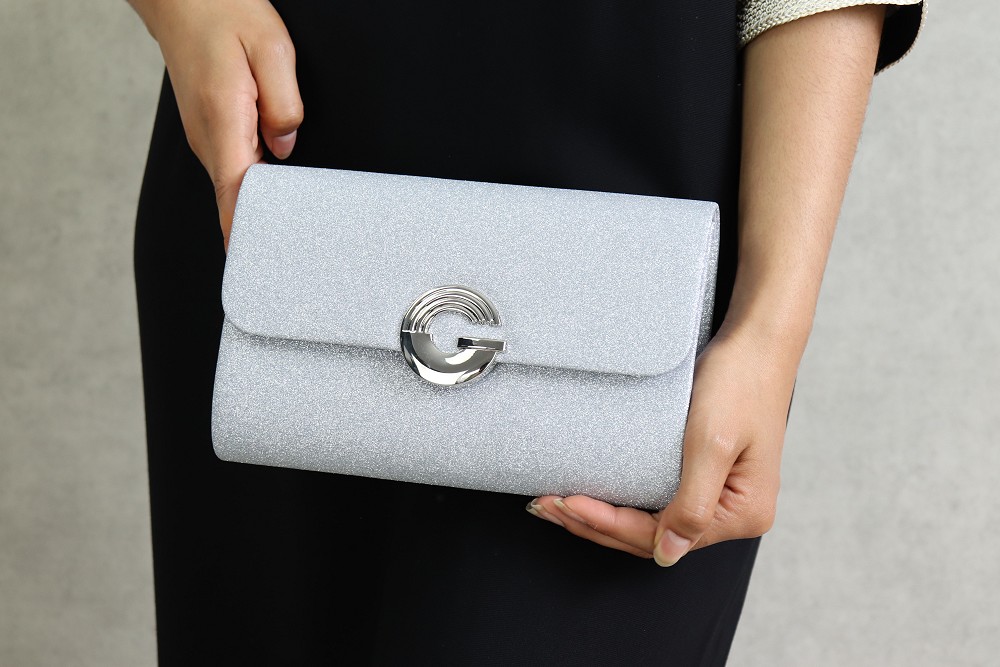 Pochette et Sac bandoulière pailleté. Rabat fermé par pression magnétique avec logo sous forme de G en métal. Une fine bandoulière en métal amovible complète ce modèle et permet de la porter aussi en bandoulière. Une petite poche de service permet de ranger vos clés ou de petits objets.