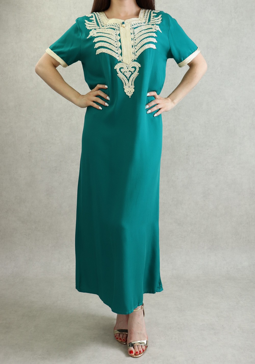 La couleur unie de cette robe est des plus flatteuses associée aux reflets lumineux des ornements dorés en feront une pièce maîtresse de votre style. Vous ne passerez pas inaperçue !
