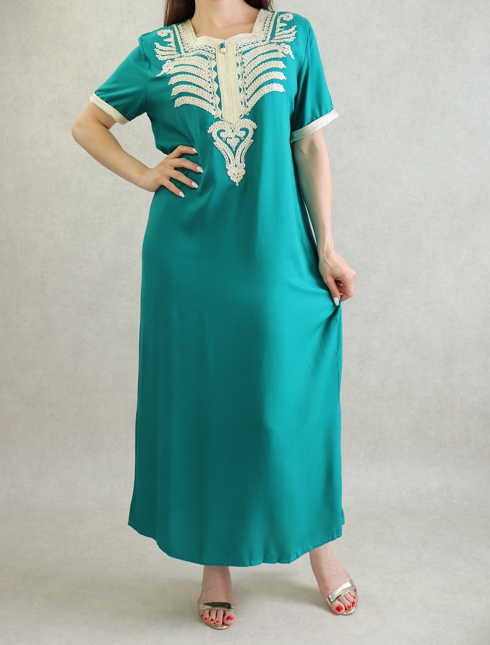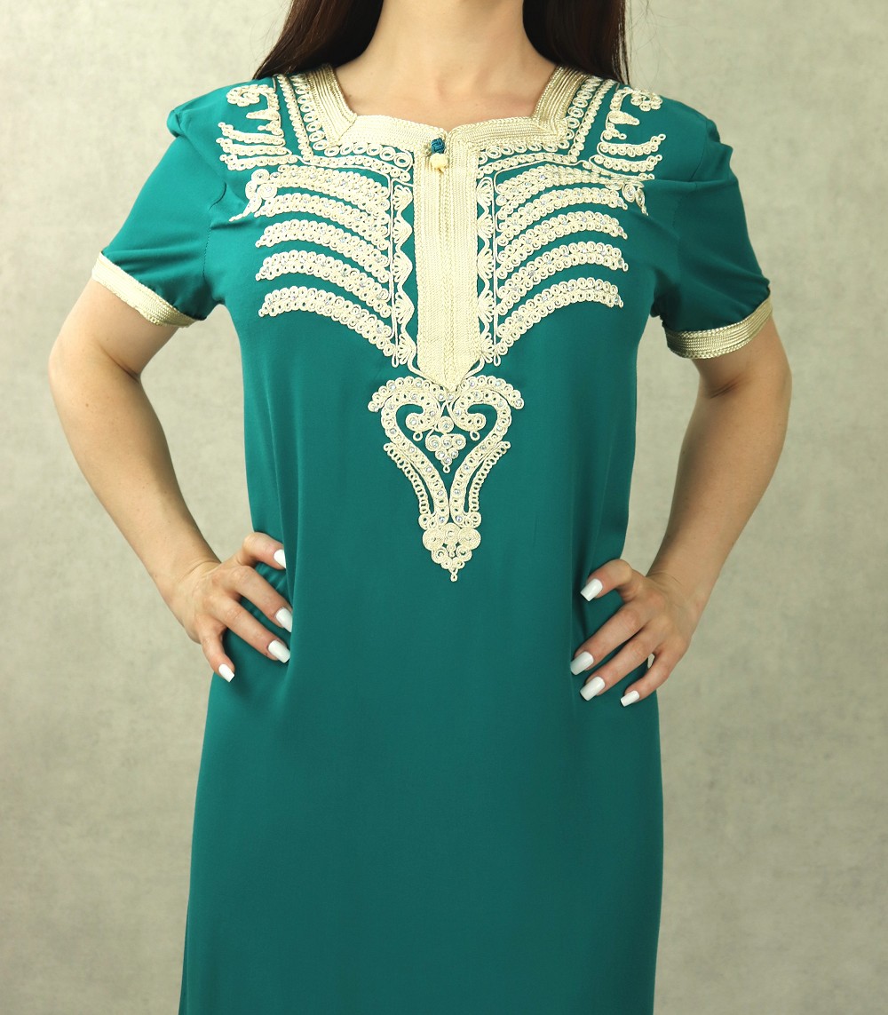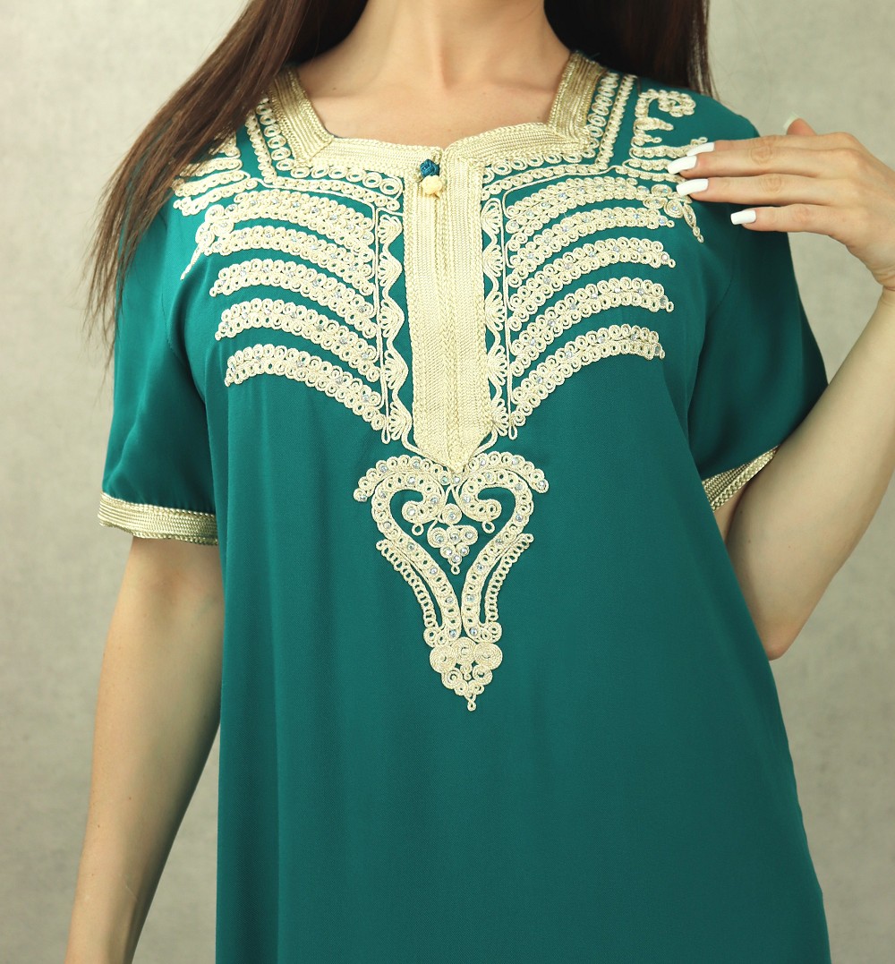 Cette robe orientale à manches courtes, encolure en cœur, tissu doux type coton et léger vous donnera une allure incroyable.