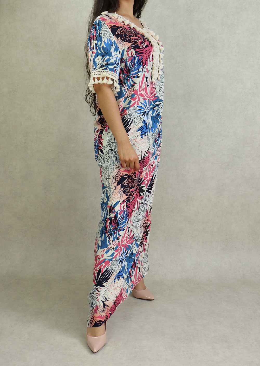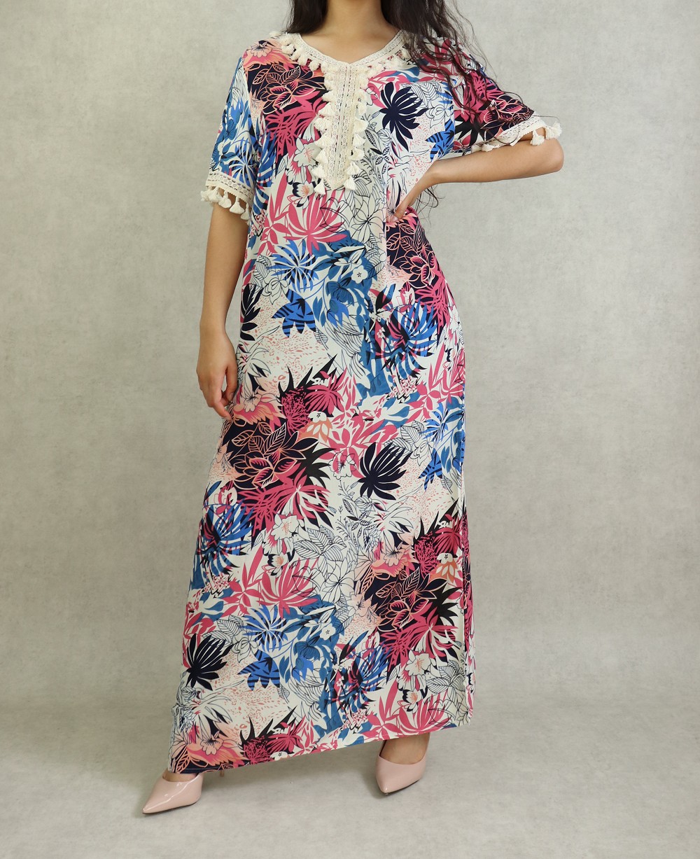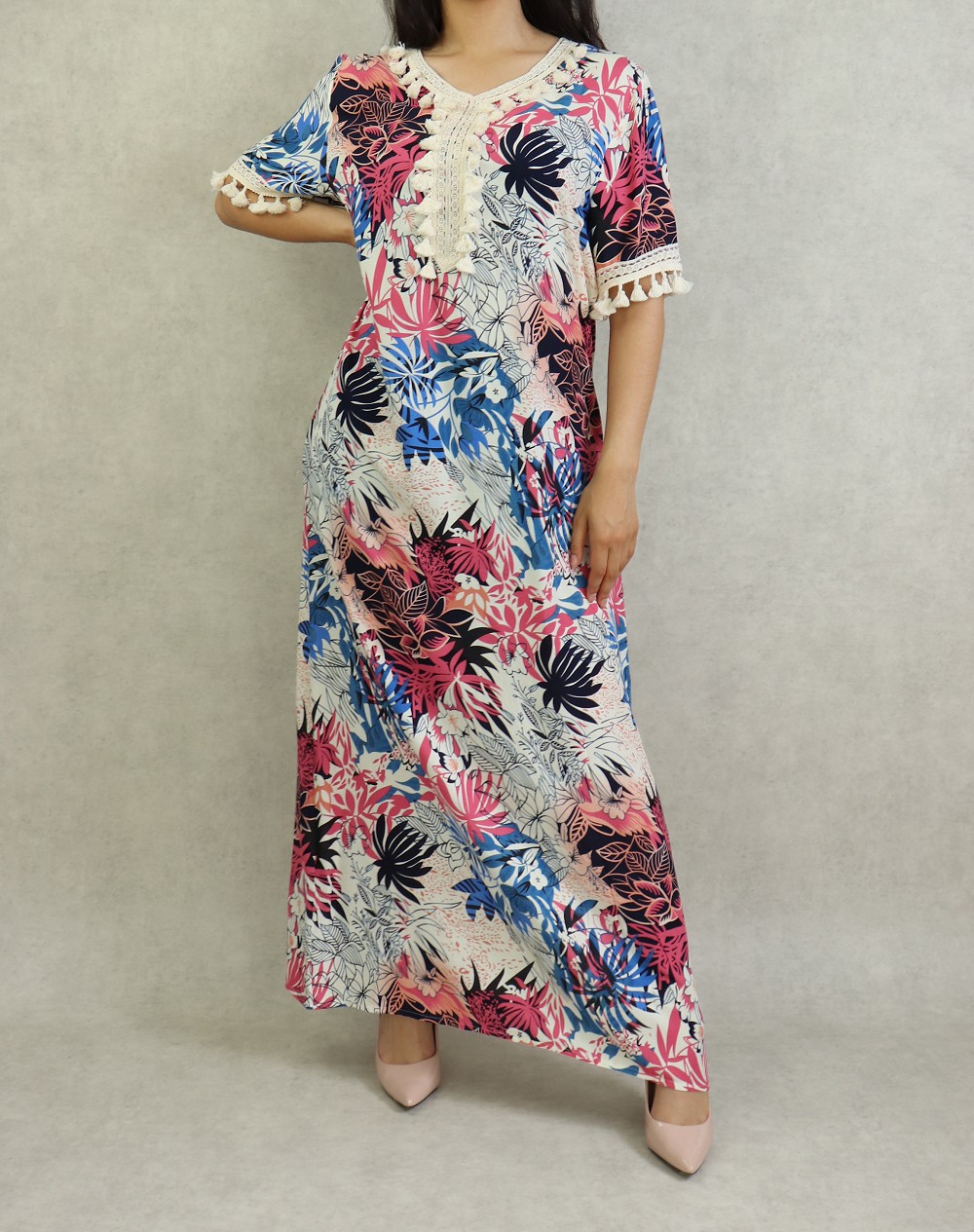 Robe longue d'été ou pour la maison à imprimé exotique pour femme, manches courtes avec broderies et pompons beige, coupe droite, tissu fluide et doux au toucher coton.