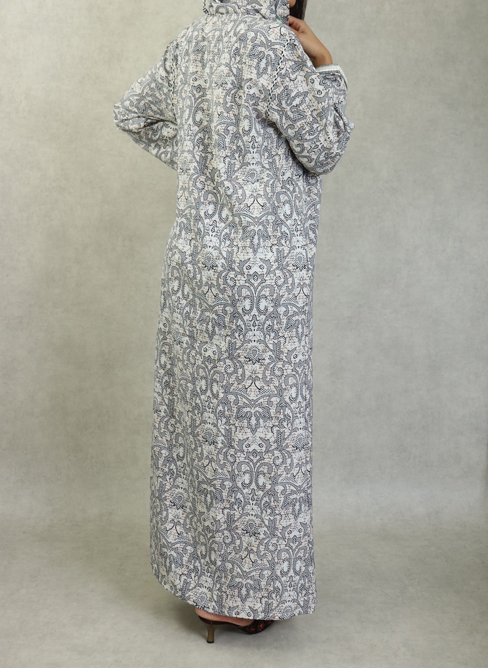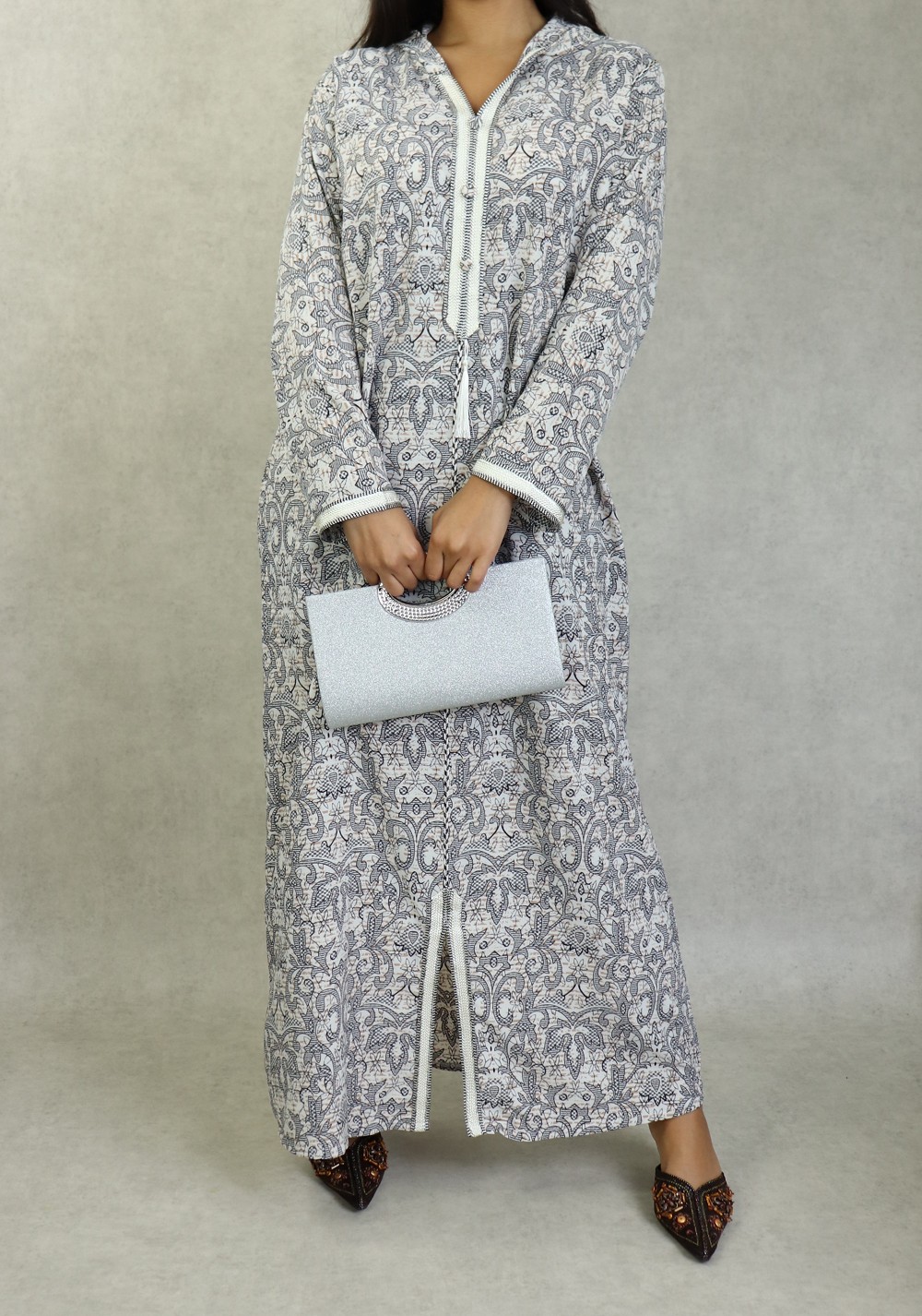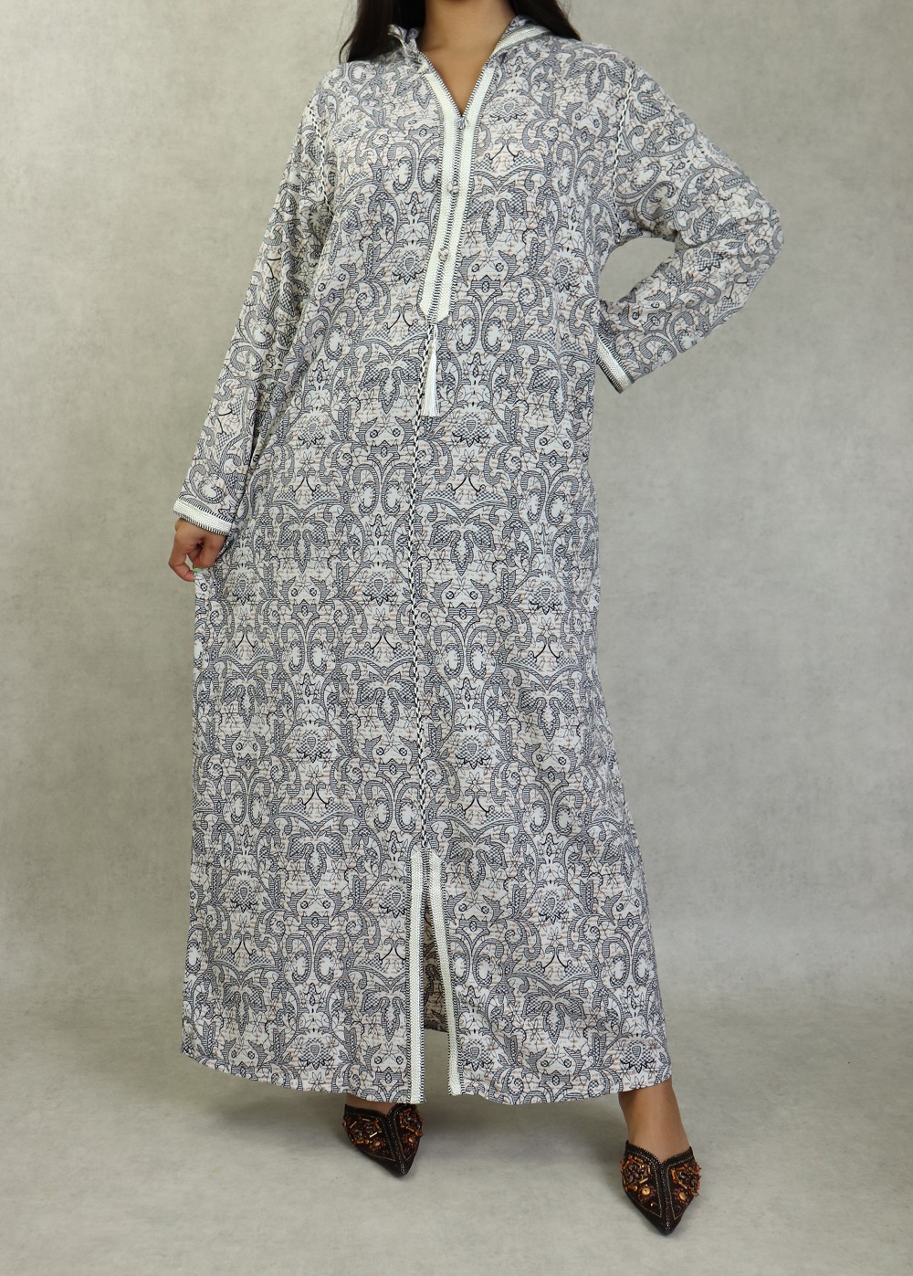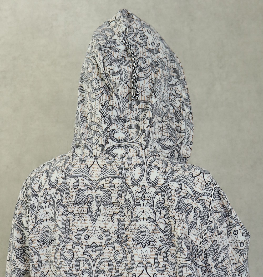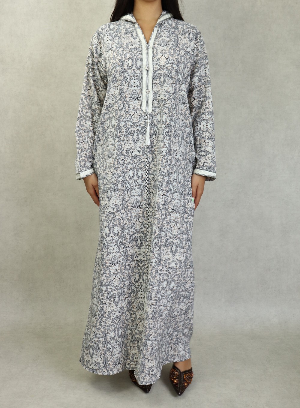 Robe longue, col en V, Manches longues, fluide et légère à fleurs, avec un liseré autour de la capuche, manches et ainsi sur le buste.