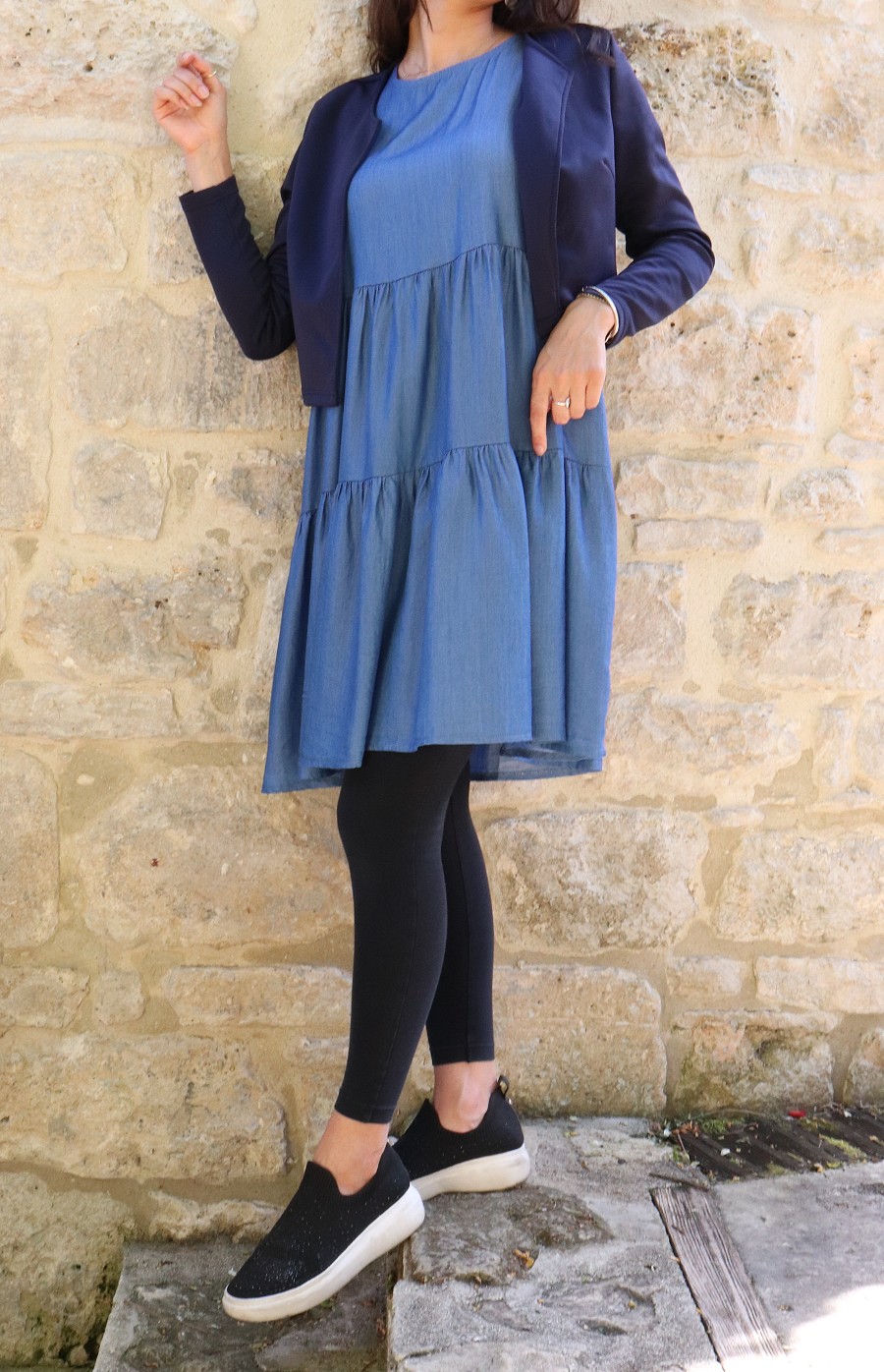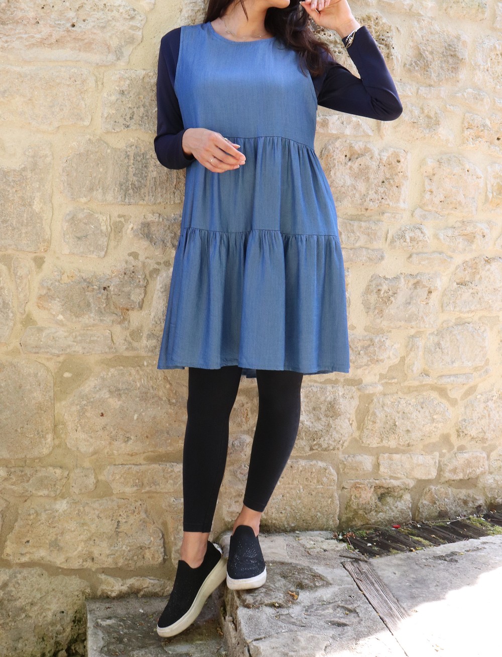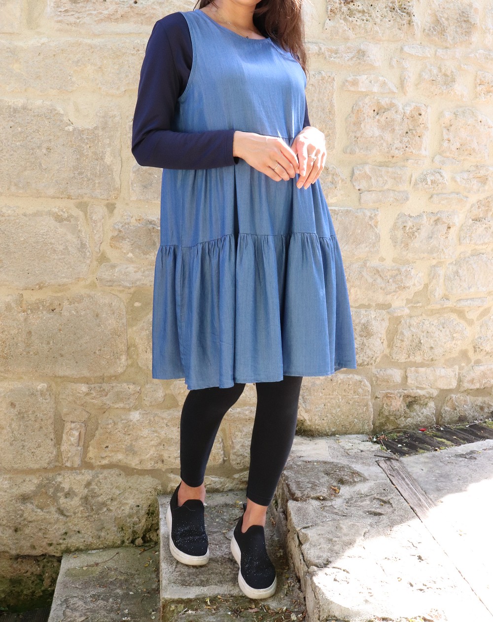 Robe tunique évasée à volants, col rond, sans manches, fermée par goutte d'eau boutonnée au dos, coupe évasée. Peut se porter de différentes façons. Elle a un petit côté frais qui nous fait craquer !