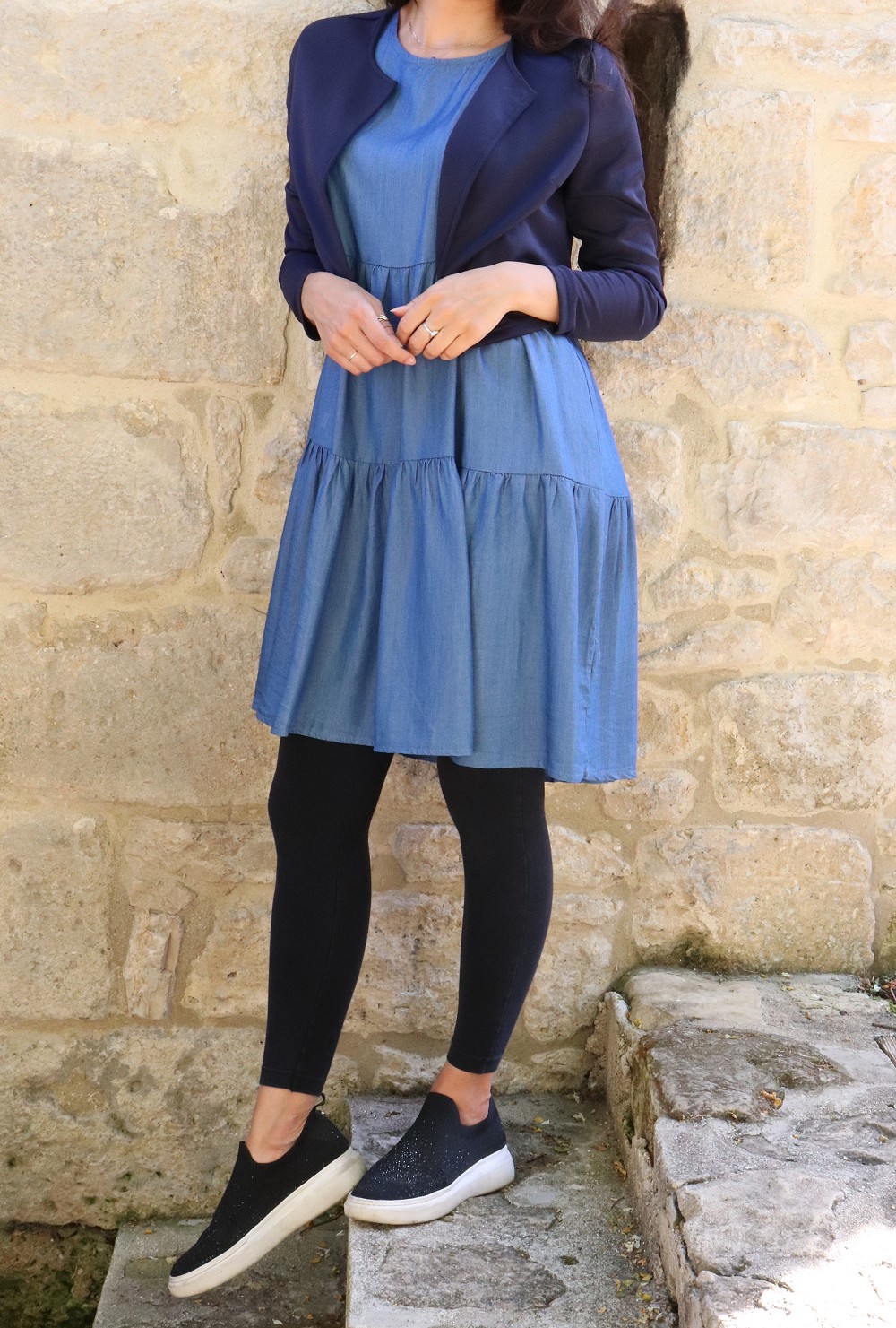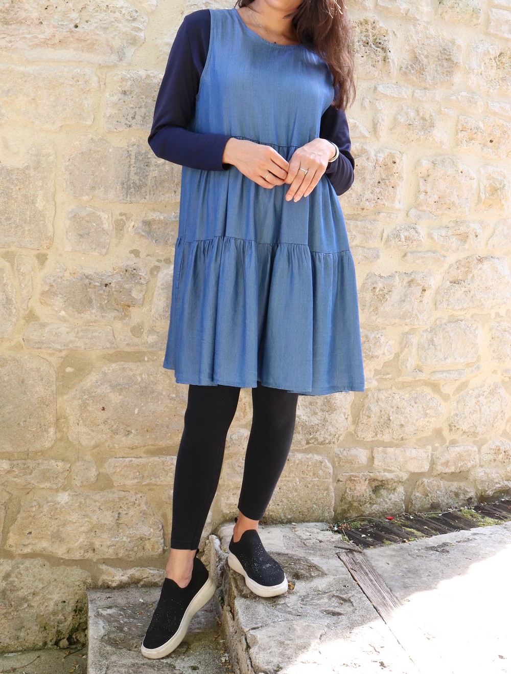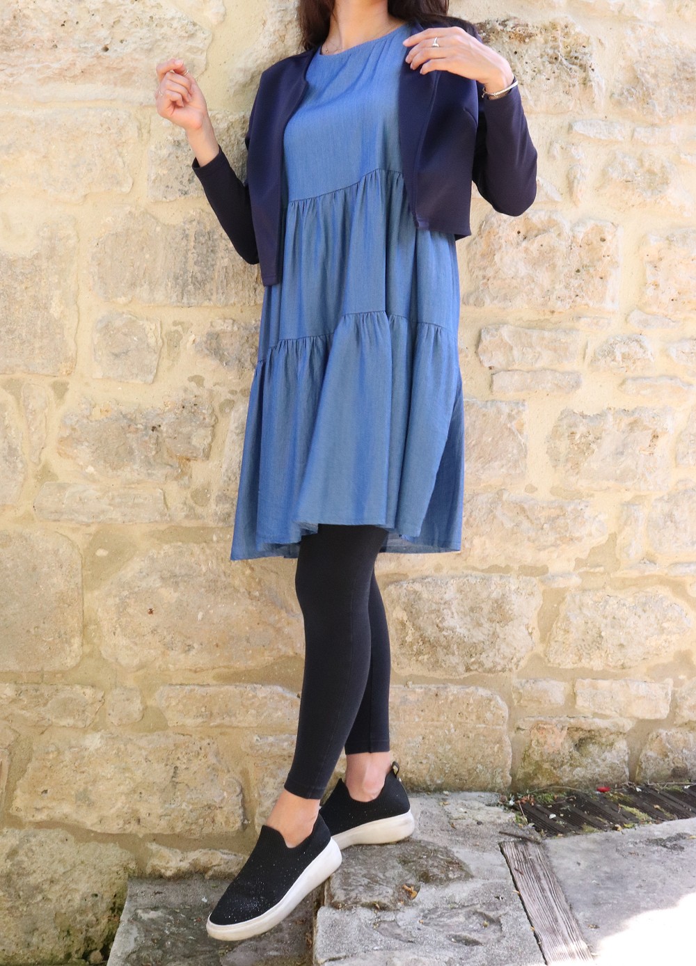 Robe tunique évasée à volants, col rond, sans manches, fermée par goutte d'eau boutonnée au dos, coupe évasée. Peut se porter de différentes façons. Elle a un petit côté frais qui nous fait craquer !
