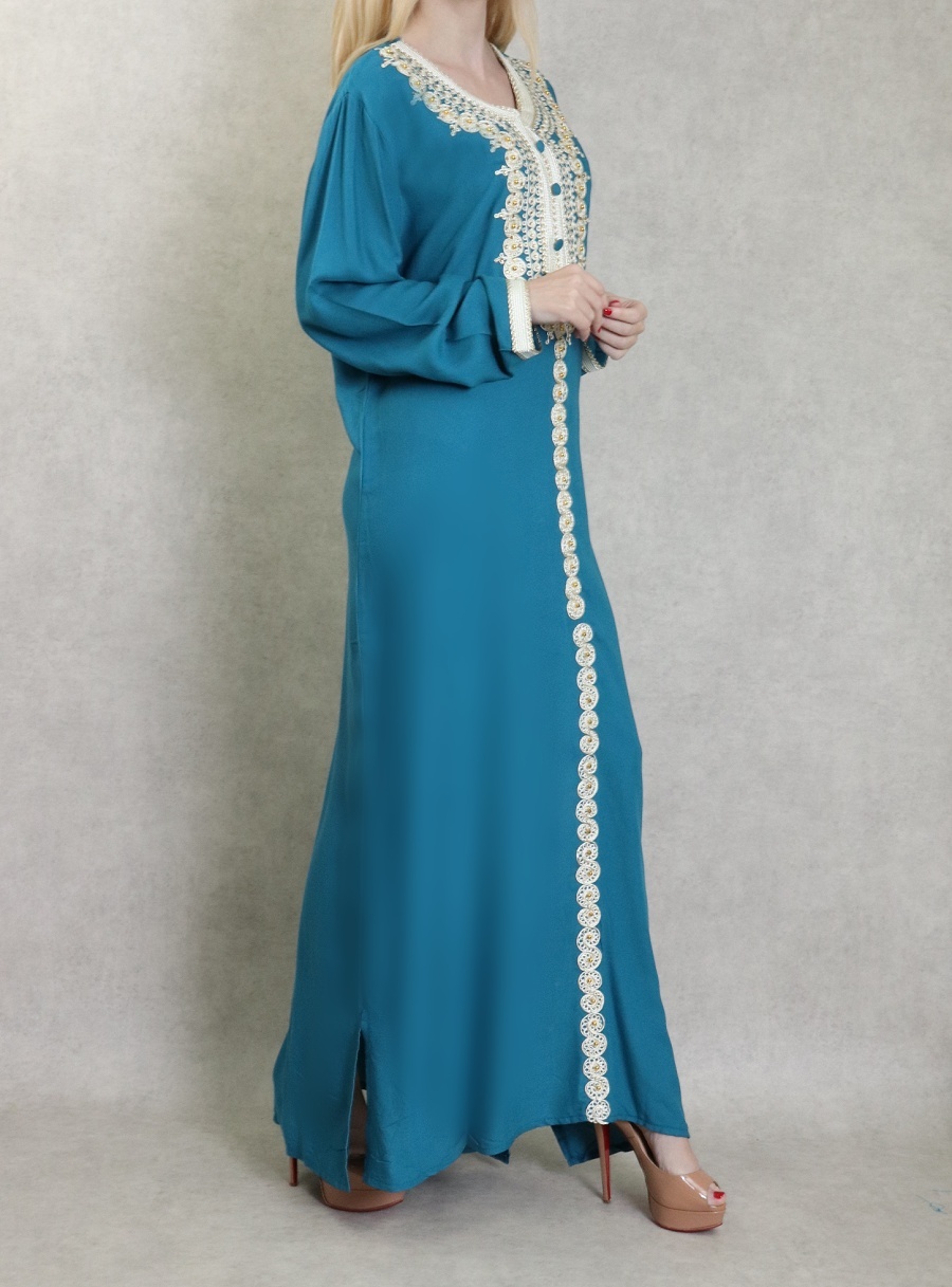 Robe Marocaine longue avec strass dorée et nombreuses broderies sur le buste et toute la longueur ; style caftan. Tissu doux de type coton/soie. Le double avantage de ce modèle est d'être confortable et élégant à la fois.