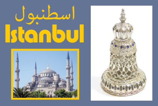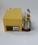 Parfum Musc d'Or "Al-Quds" pour hommes dans jolie bouteille métallique argentée décorée de perles bleues.
