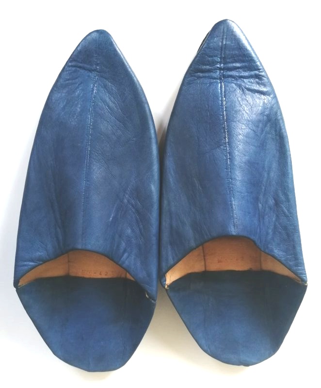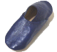 Babouche homme citadine FASSI, fabriqué en cuir traité, de couleur Bleu jean; cette babouche est simple et possède une extrémité pointue.