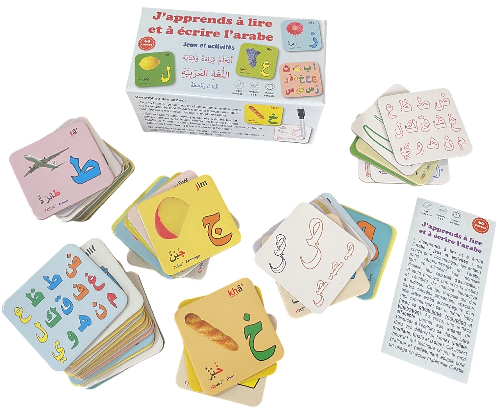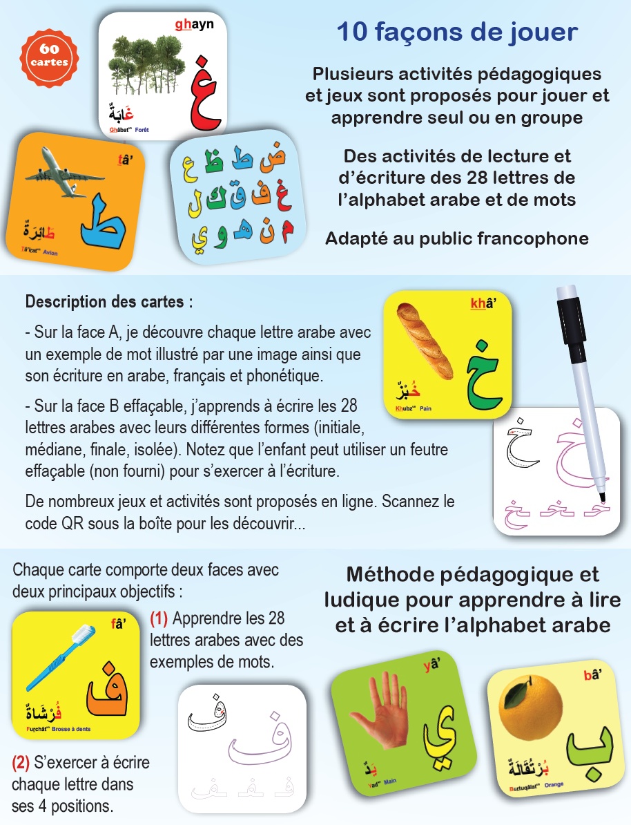 - Sur la face A, je découvre chaque lettre arabe avec un exemple de mot illustré par une image ainsi que son écriture en arabe, français et phonétique.