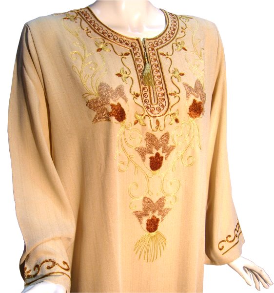 Robe Leyla de couleur beige avec broderie dorée sur le devant et les manches...