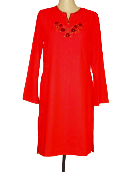 Tunique longue rouge avec des petites fleurs sur le devant.