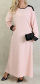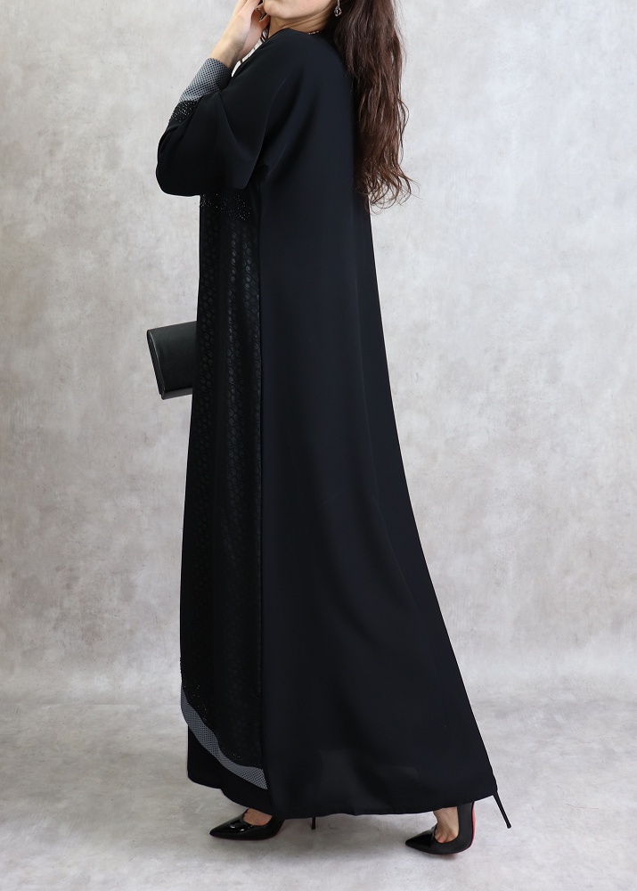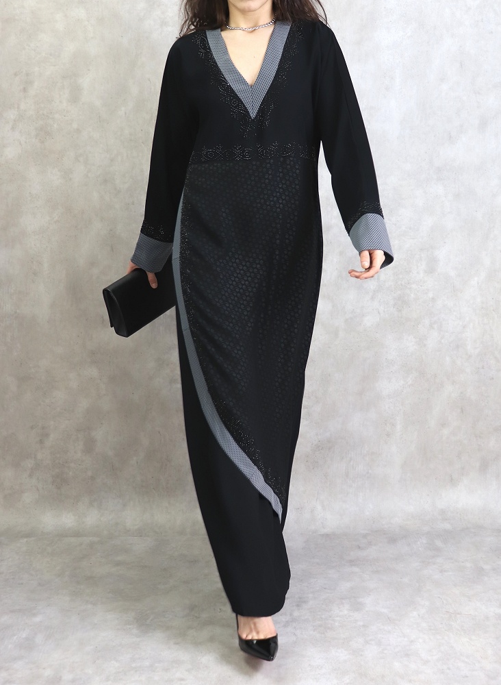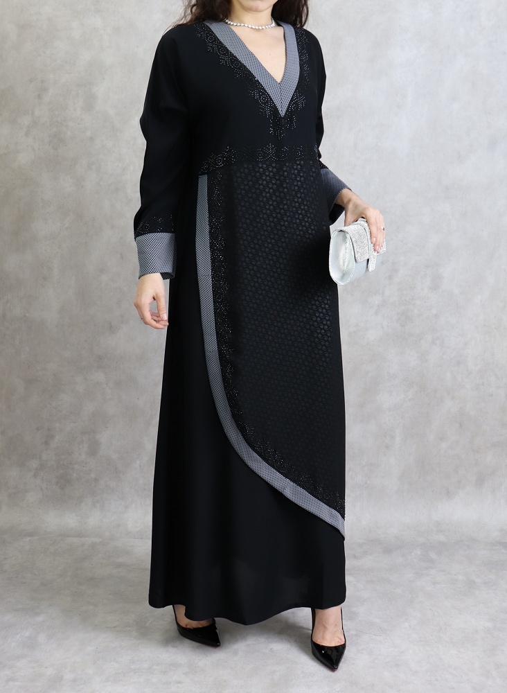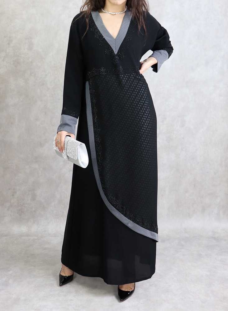 Abaya noire effet portefeuille, col en V , décorée de strass, sur toute la longueur ainsi que sur les extrémités des manches. (coupe évasée). Fournie avec son écharpe noire assortie.