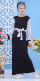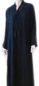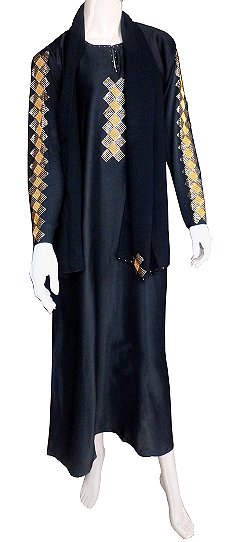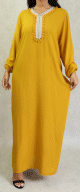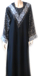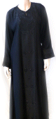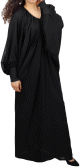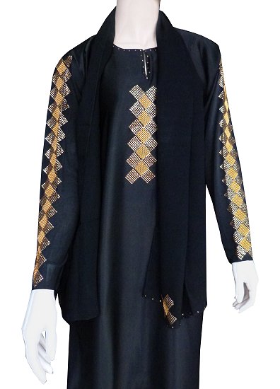 Très jolie abaya en tissu satiné et manches en matière élasthanne. Le tout décoré de strass brillants dorés et assorti d'un châle. Coupe evasée vers le bas.