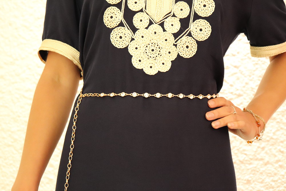 Ceinture dorée à strass avec une chaine finition petite fleur qui permettra de l'ajuster à votre taille.