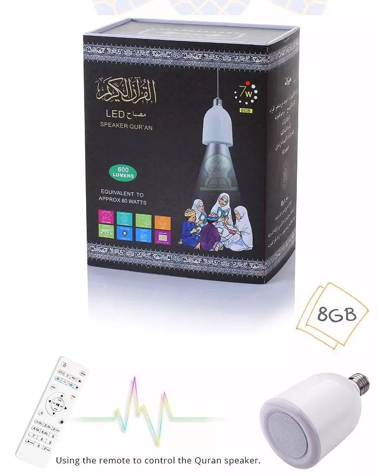 Double fonction : Lampe LED + Haut parleur avec télécommande... contient 25 récitateurs complet du Coran en qualité HD, 25 traductions audio du Coran dont le français et l'anglais.