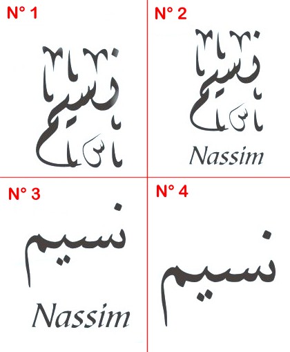 Profitez de recevoir cette tasse avec l'inscription du prénom calligraphié en arabe et/ou en français ou un message en français. S'il s'agit d'un prénom, vous pouvez choisir un style parmi les quatre (voir image ci-dessous).